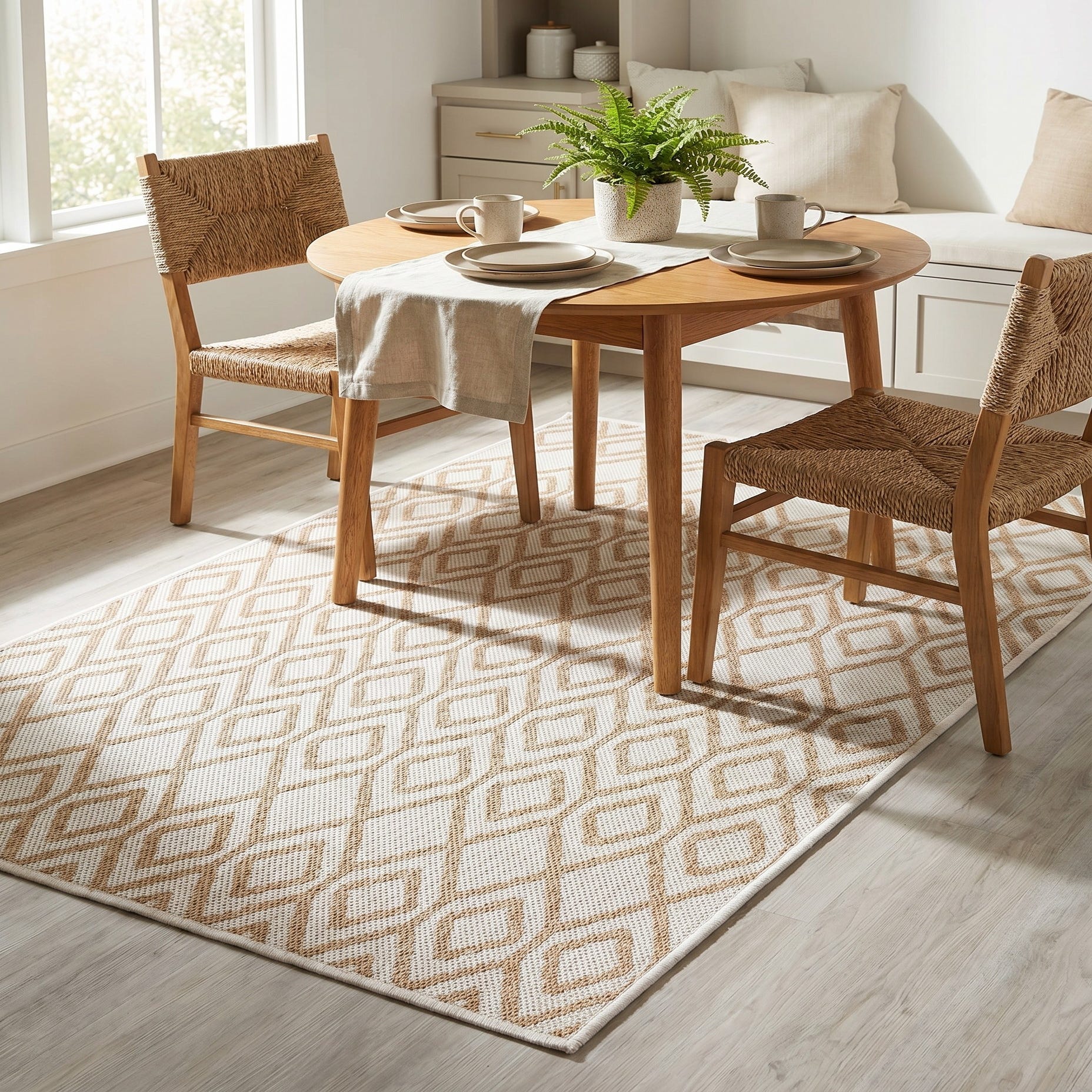 This suited my needs perfectly for a little outdoor breakfast area. The pattern mimics my garden lattice pattern. These photos were taken at night but it shows up well. Dries out quickly after rain