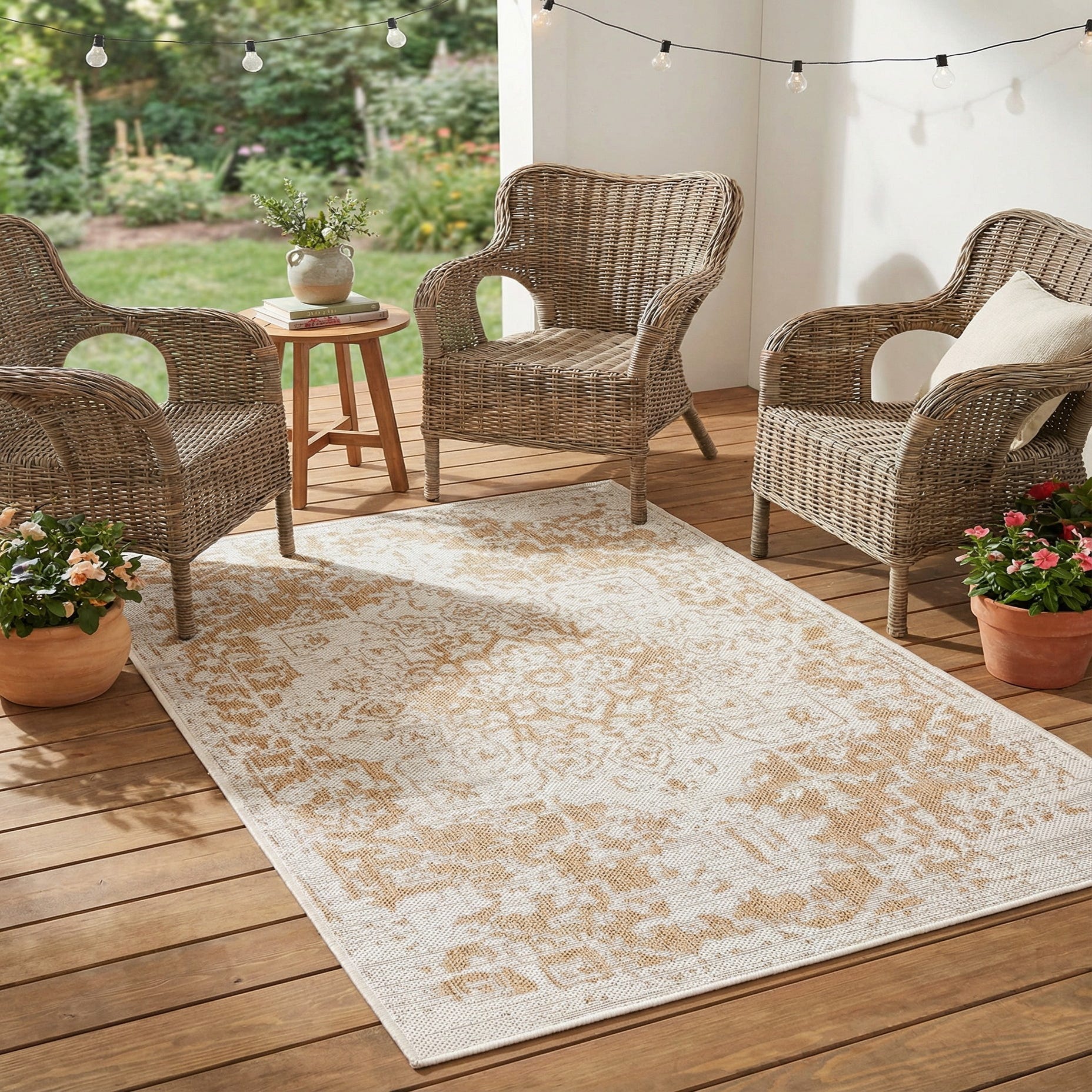 Machine-made from 100% polypropylene, the construction feels sturdy yet lightweight, suitable for both indoor and covered outdoor settings. It pairs naturally with light-wood or rattan furniture, neutral linen upholstery, and coastal or farmhouse palettes, and can anchor a sunroom, covered patio, or entry area without overpowering the space. Layer it beneath a small bistro set or place it in front of a sofa to introduce warmth and understated pattern where you want quiet, everyday style.