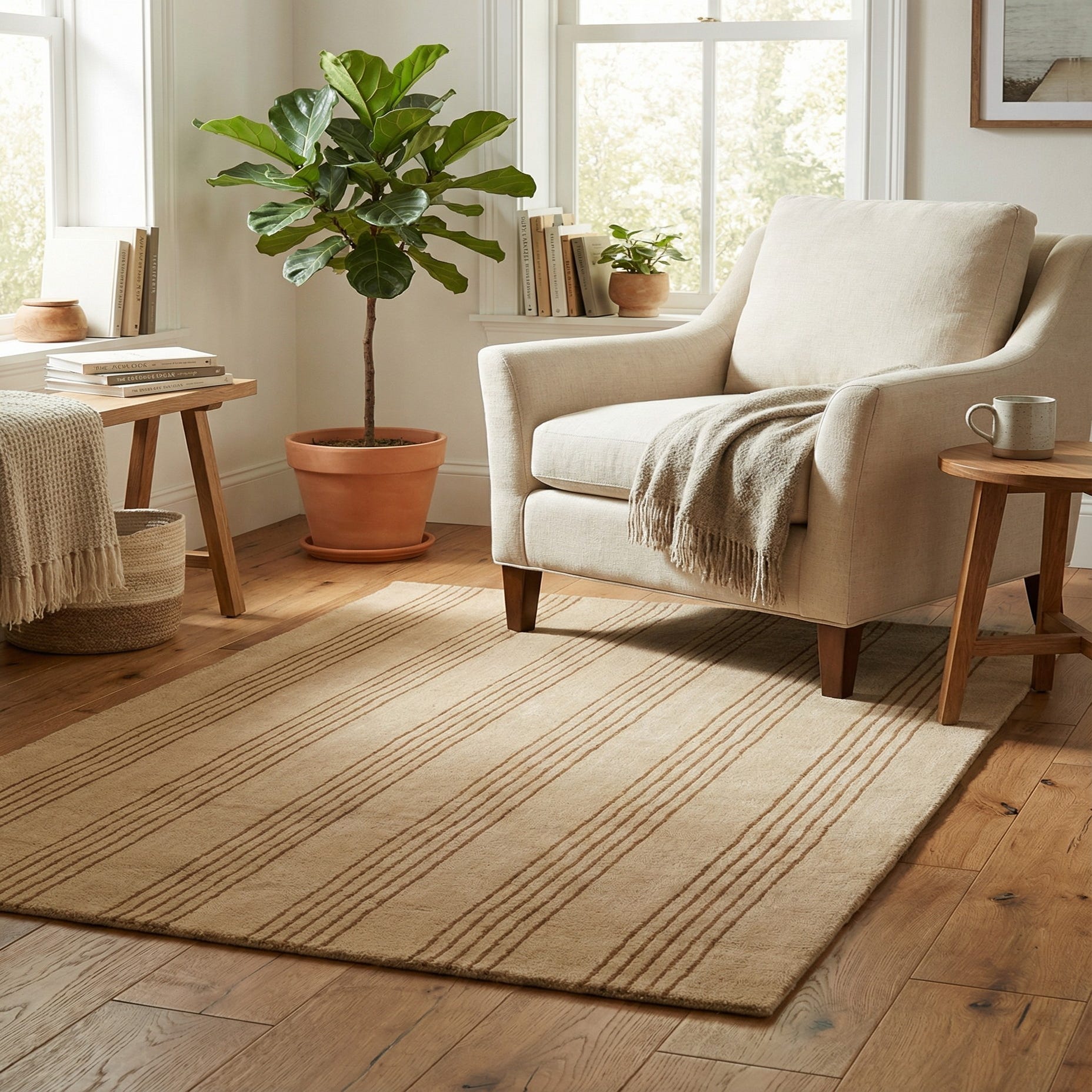 This rug pairs naturally with light-wood finishes, linen upholstery and leather accents, and it works well in modern, Scandinavian, transitional or farmhouse interiors. Use it to ground a seating area, layer it at the foot of a bed, or run it down a hallway or entry to add subtle visual direction. Its neutral palette and low-contrast striping make it easy to mix with patterned pillows, textured throws or woven baskets for a collected, comfortable look.