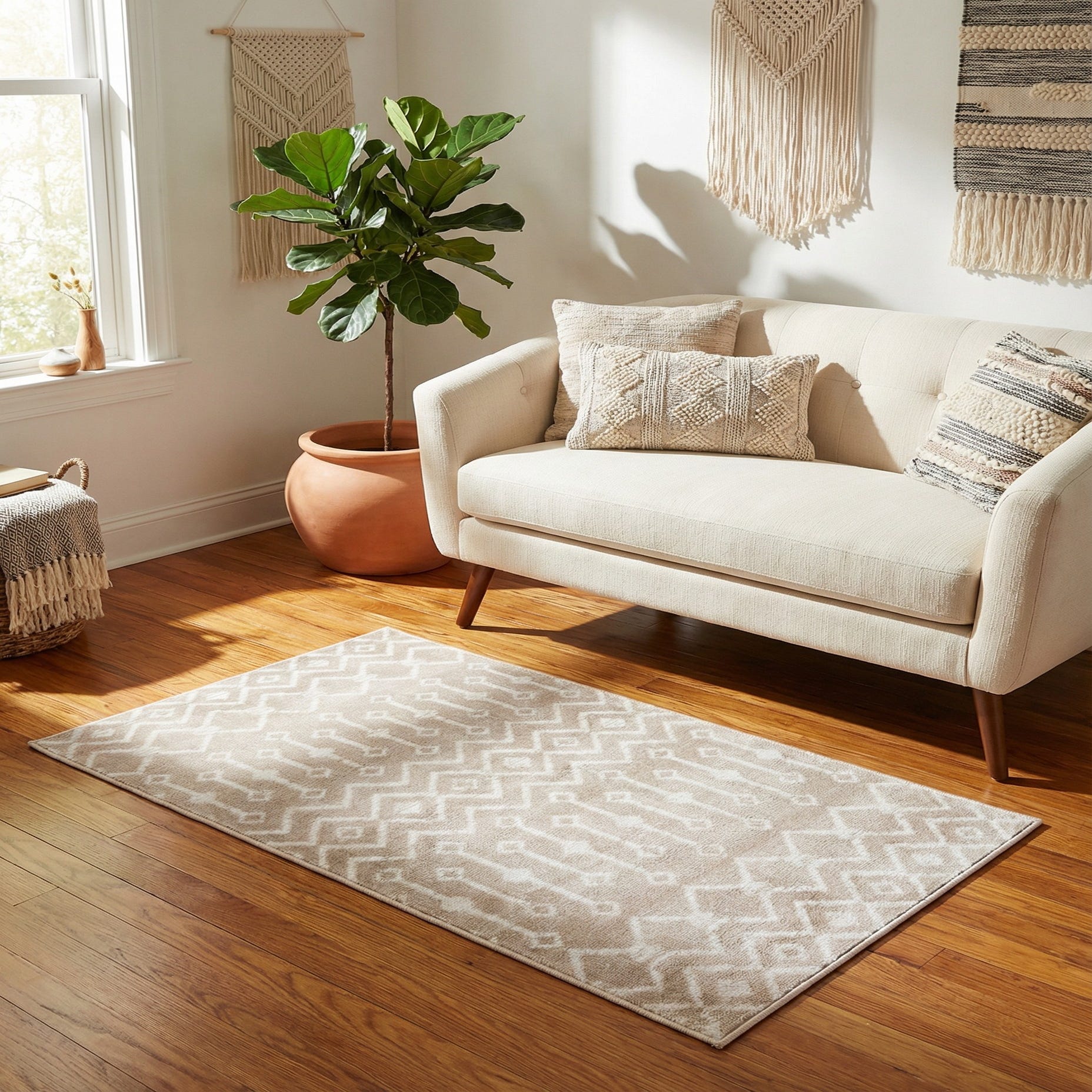 Machine-made of 100% polypropylene, the rug has a low, dense pile that feels smooth underfoot and holds its shape well in everyday spaces. Its neutral tones and simple geometry make it a good choice for a living room under a coffee table, layered at the foot of a bed, placed in an entryway, or used to soften a reading nook. It pairs nicely with light wood and woven textures for a Scandinavian or coastal look, and also complements relaxed modern farmhouse or understated bohemian interiors.