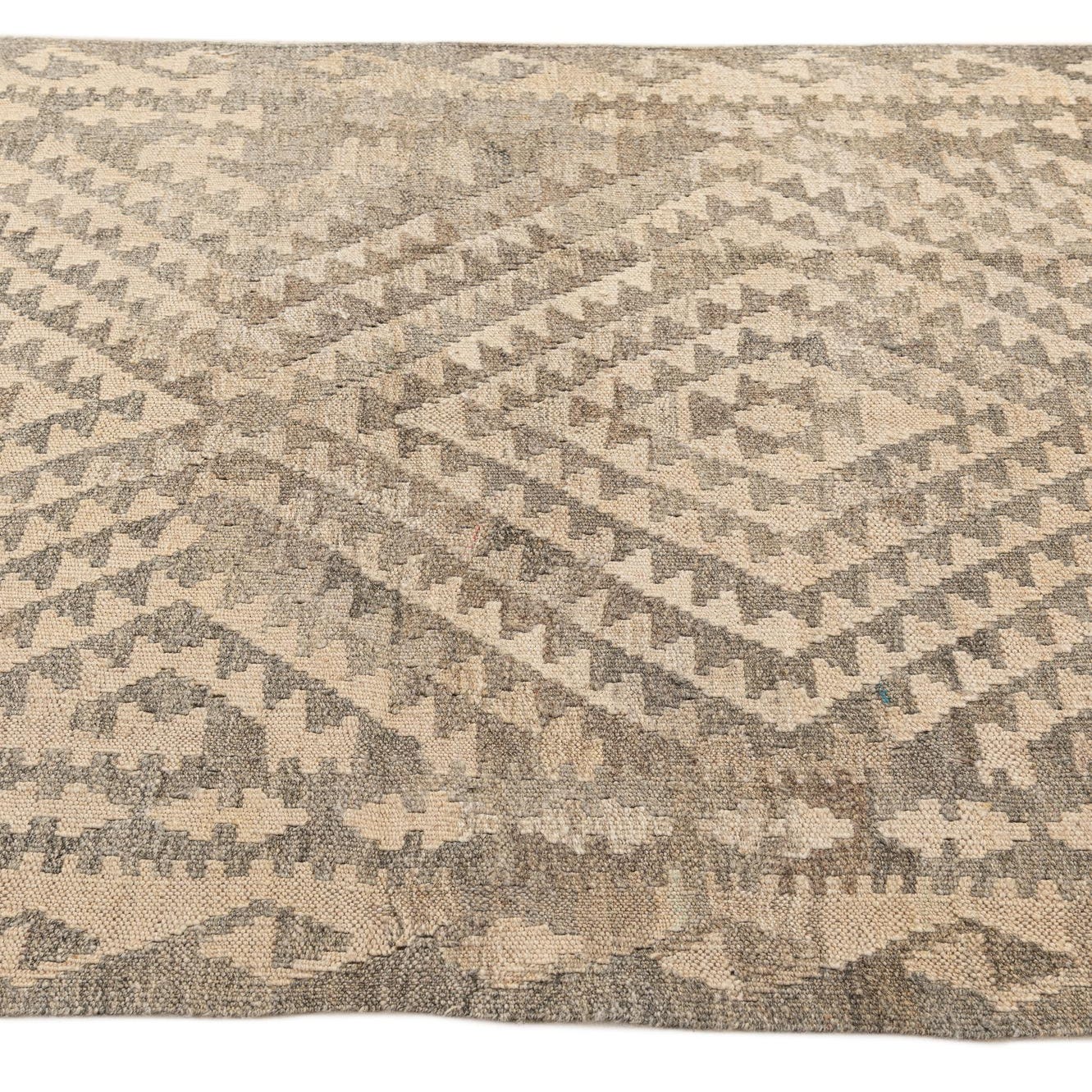 A 3x5 rectangular Kilim Maymana rug featuring a tribal geometric diamond pattern in shades of brown, tan, and cream.