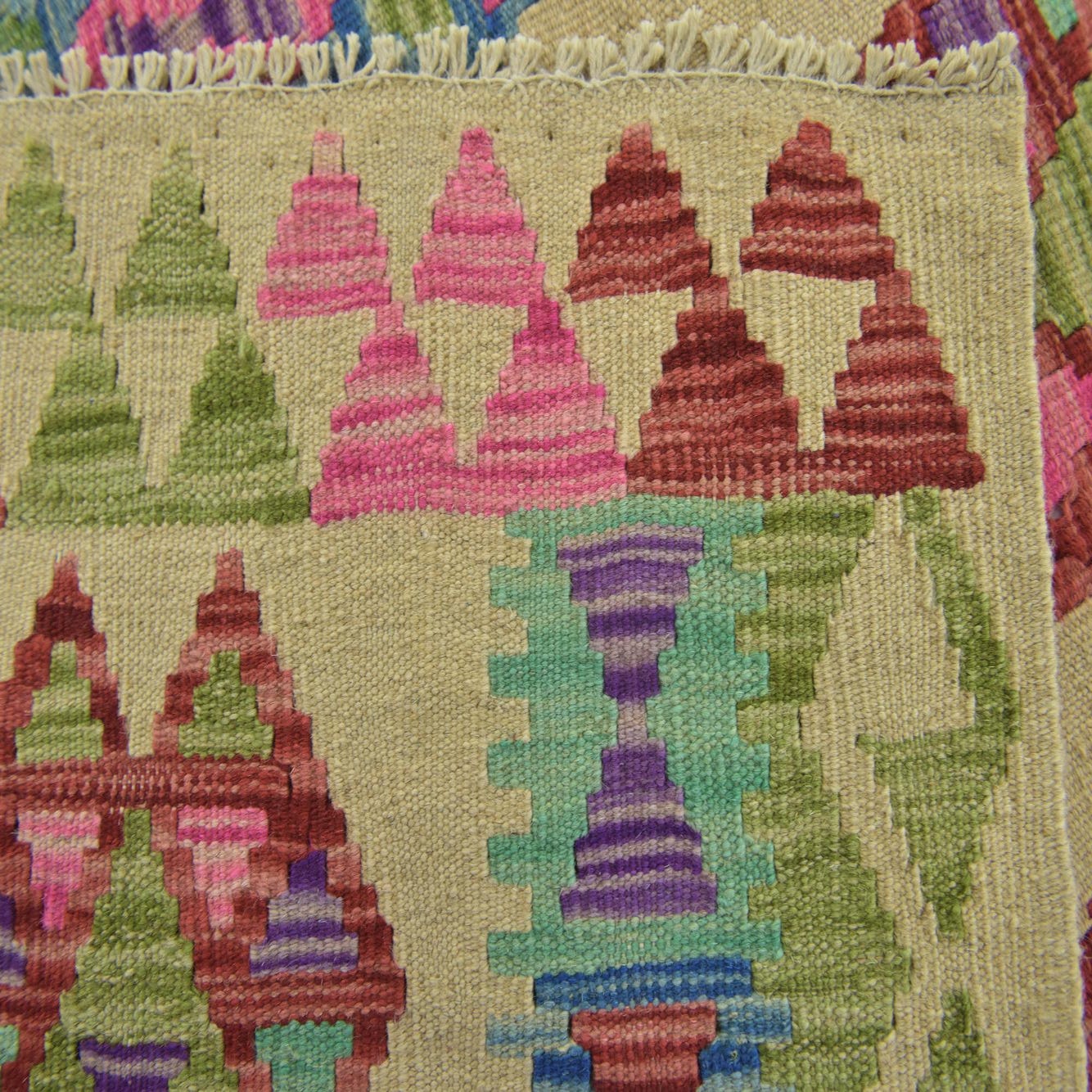 A 3x5 rectangular Kilim Maymana rug with a cream background, featuring colorful tribal geometric patterns in pink, blue, green, and purple.