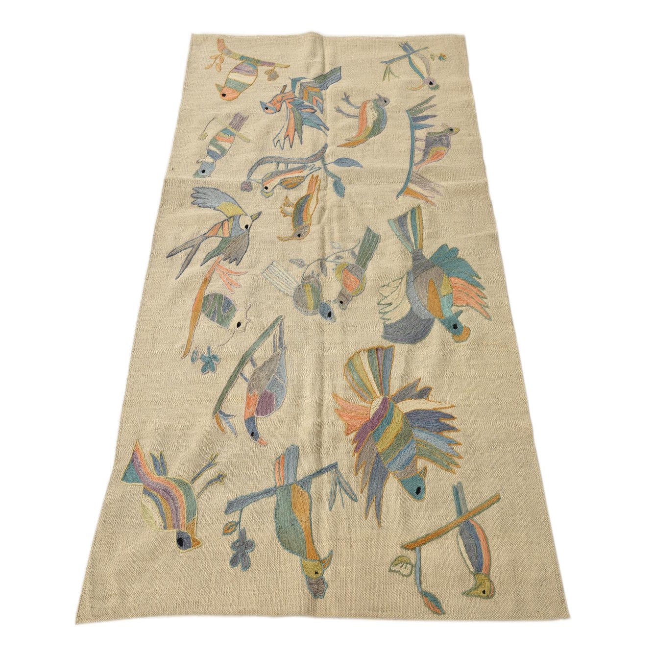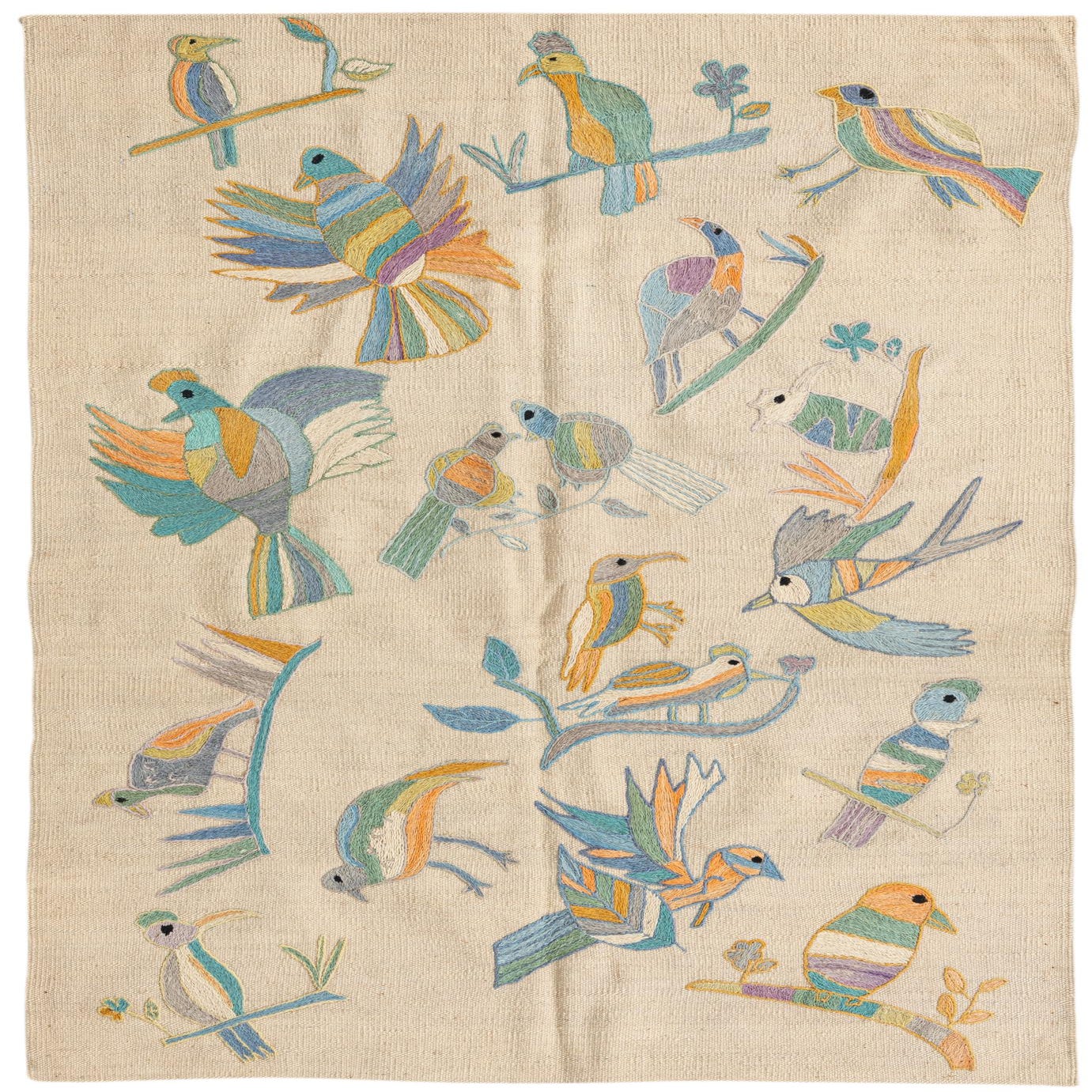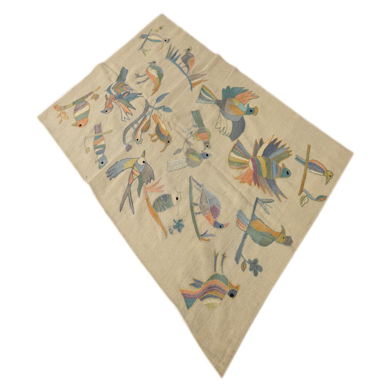 A 3x5 rectangular Kilim Suzani rug featuring colorful, abstract bird and floral motifs on a cream background.