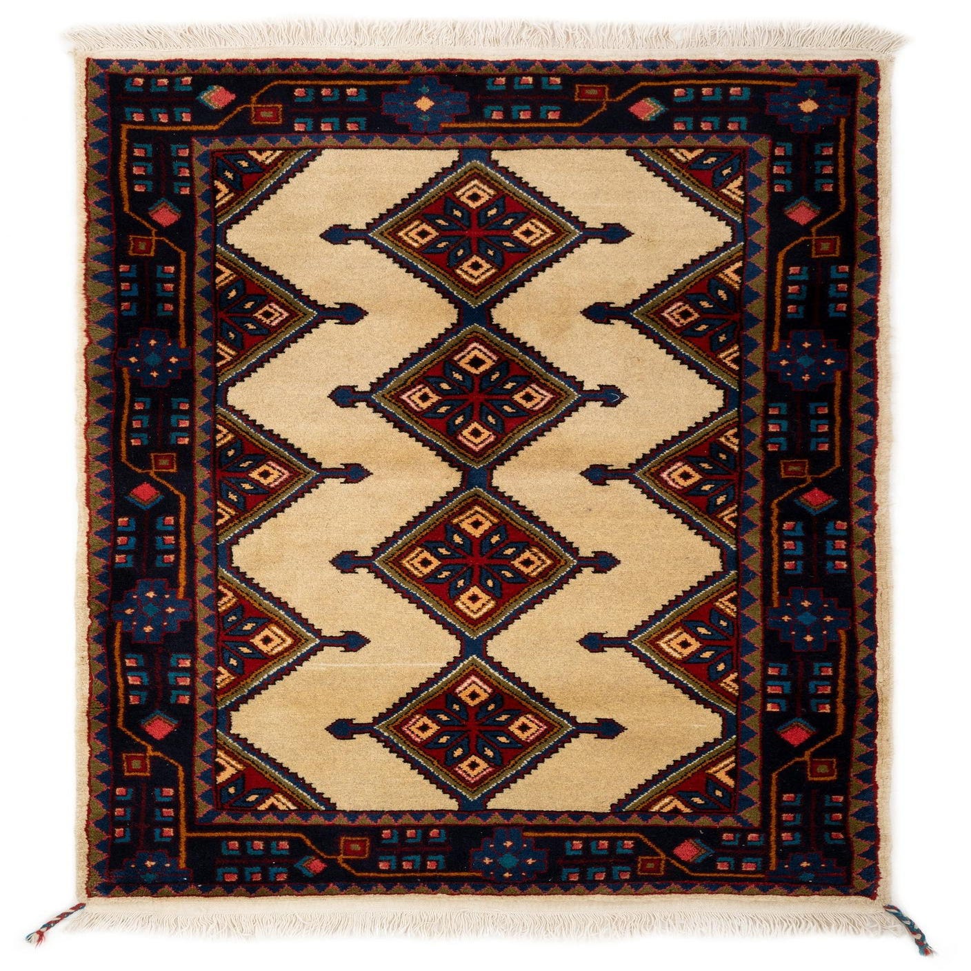 A 3x5 rectangular Koliaei rug with a cream field and a repeating pattern of tribal diamonds in red, blue, and brown, framed by a dark border.