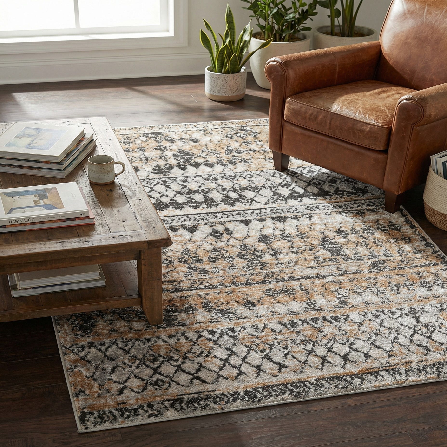 This rug works well in a variety of interiors: place it in an entry or kitchen to add pattern without overwhelming the space, layer it in a living room under a coffee table for a cozy, grounded focal point, or set it beside the bed to warm a bedroom. Its neutral palette pairs easily with modern farmhouse, transitional, bohemian, or contemporary décor—pair with natural wood tones, leather seating, or light linen upholstery to let the pattern and warm beige background complement the room’s textures.