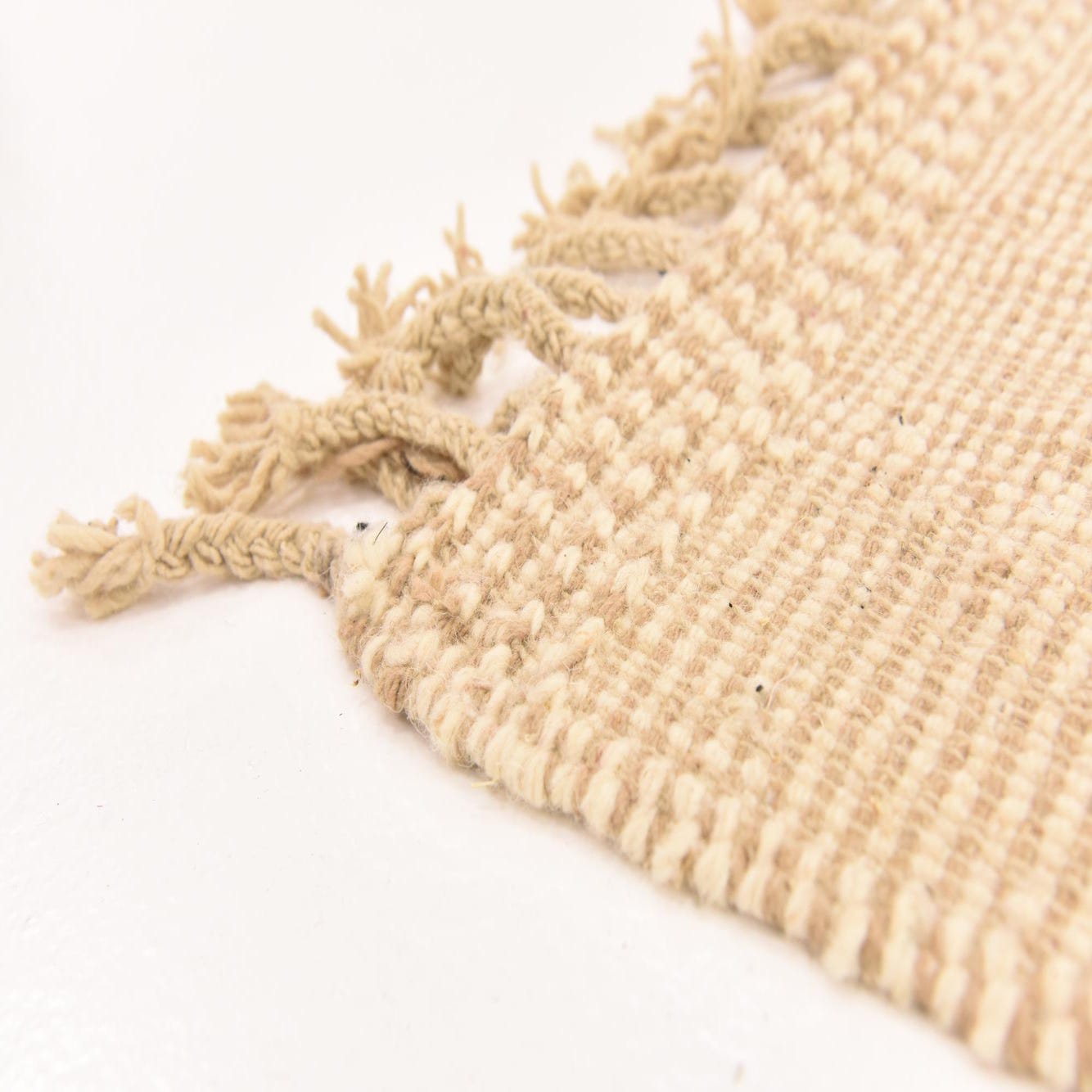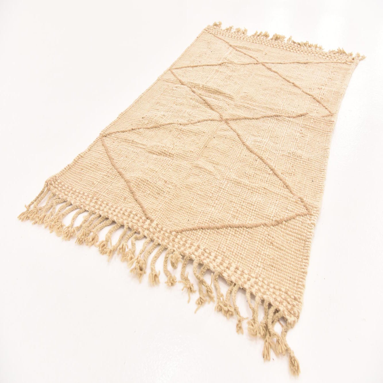 Hand-knotted from 100% wool, this rug presents a warm beige ground threaded with cream and tan. An oversized diamond motif, created by slightly raised tan lines, runs the length of the piece and provides clean geometric interest without heavy contrast. The hand-knotting creates a low-profile, nubby texture with subtle variations in yarn and weave, offering a tactile, natural feel underfoot and a visible handcrafted finish, including short knotted fringe at each end.