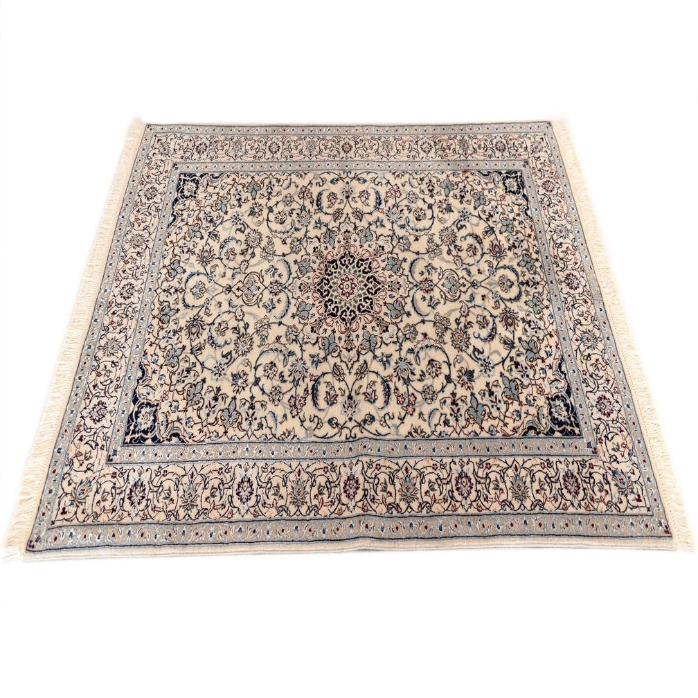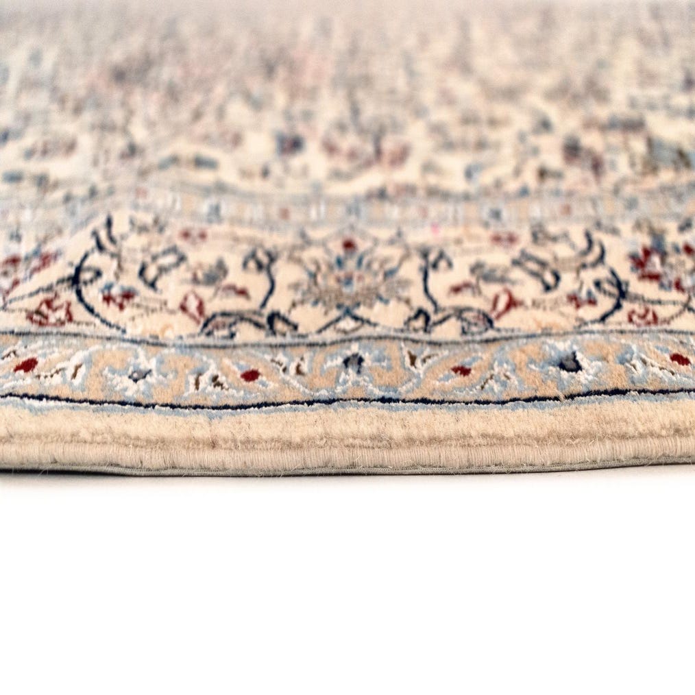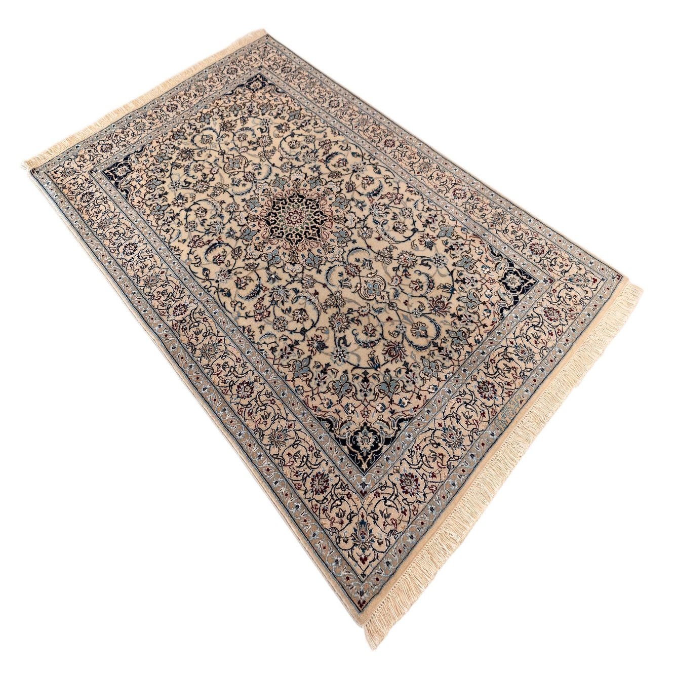 A 3x5 rectangular Persian rug with a cream background, intricate floral patterns in blue and brown, and a detailed border.