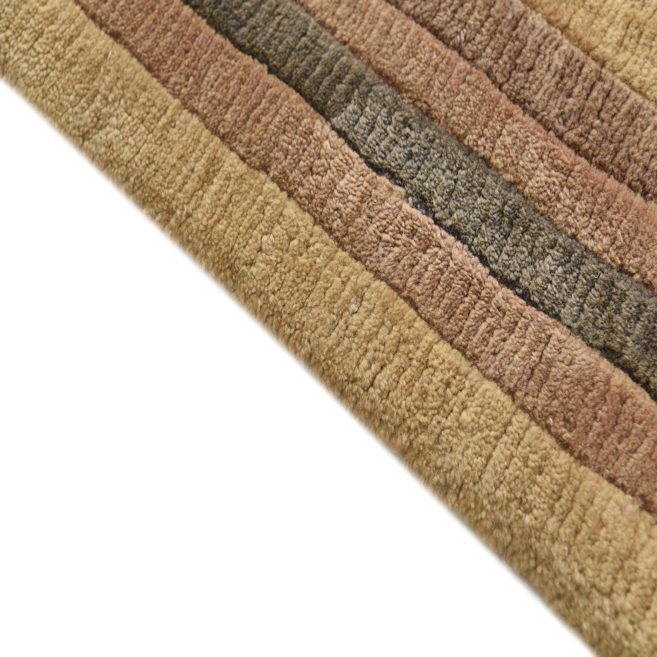 A 3x5 rectangular wool rug featuring a tan field with a modern border in varying shades of brown, tan, and dark gray.