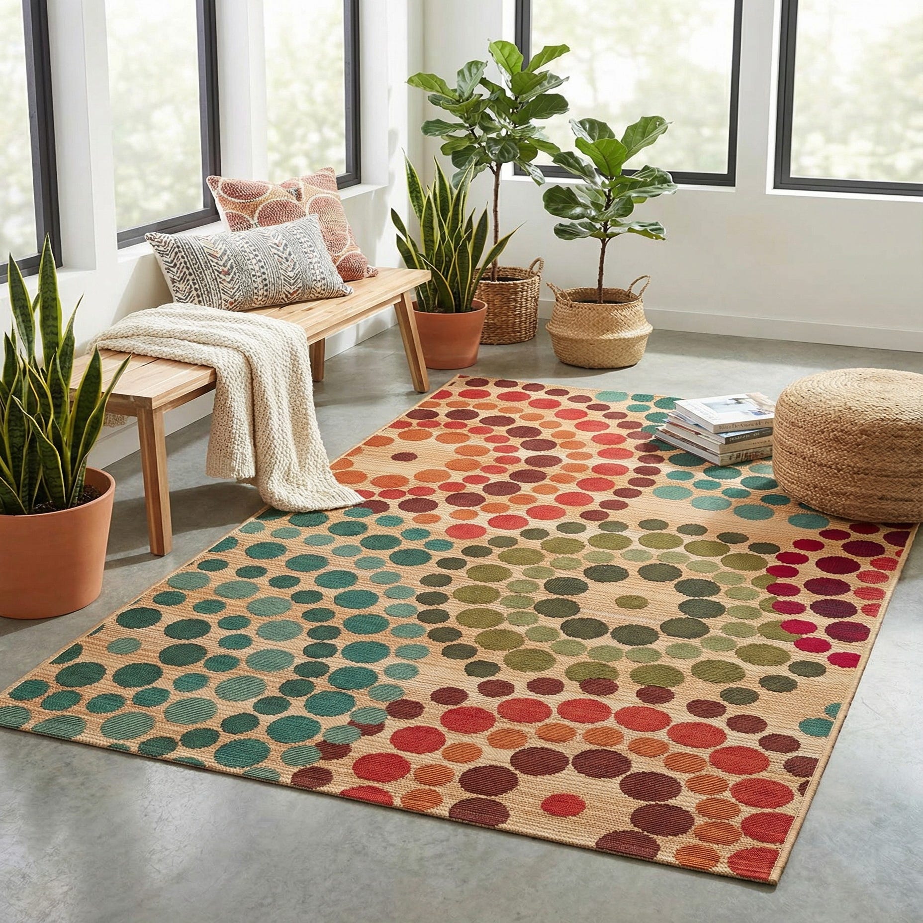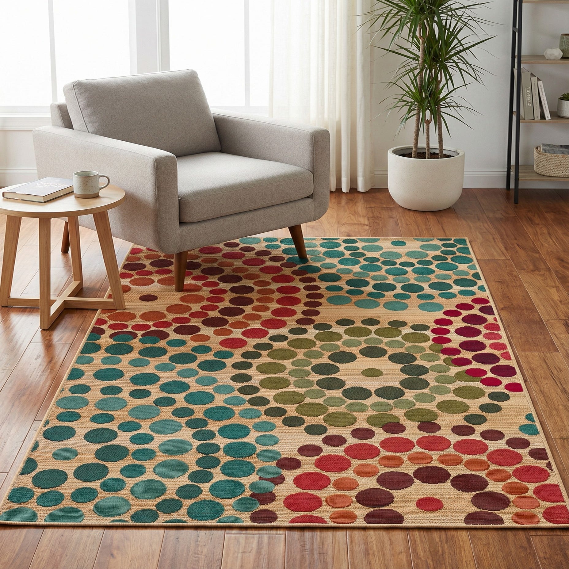 A playful field of layered circles spreads across a warm beige ground, creating a modern, graphic look with a relaxed feel. The pattern uses clusters of dots in shades of blue and light blue, green and olive, balanced by warm tones of gold, orange, red and burgundy, with brown accents that add depth. The machine-made construction in 100% polypropylene gives the surface a low-profile, tightly woven hand with subtle horizontal ribbing you can see and feel—firm underfoot and smooth to the touch.