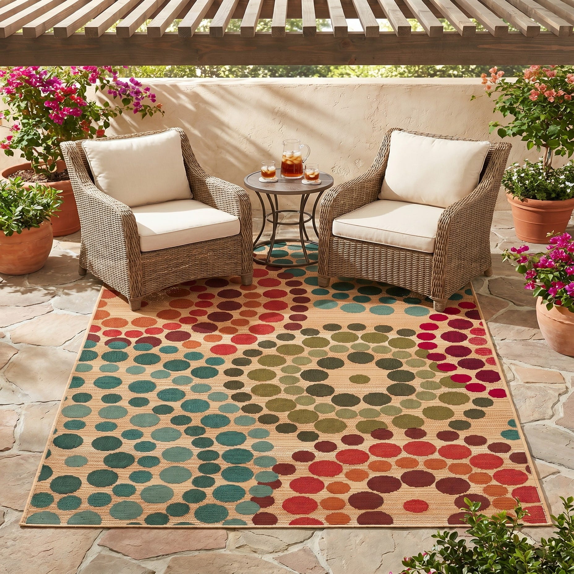 Fell in love with this rug when I saw it on-line for its delightful pattern and vivid colors. It arrived in two days from the day ordered about a week ago. We put it down on our renovated deck today...it is even more awesome than we thought it would be! The colors and pattern outset the colors of the deck perfectly.