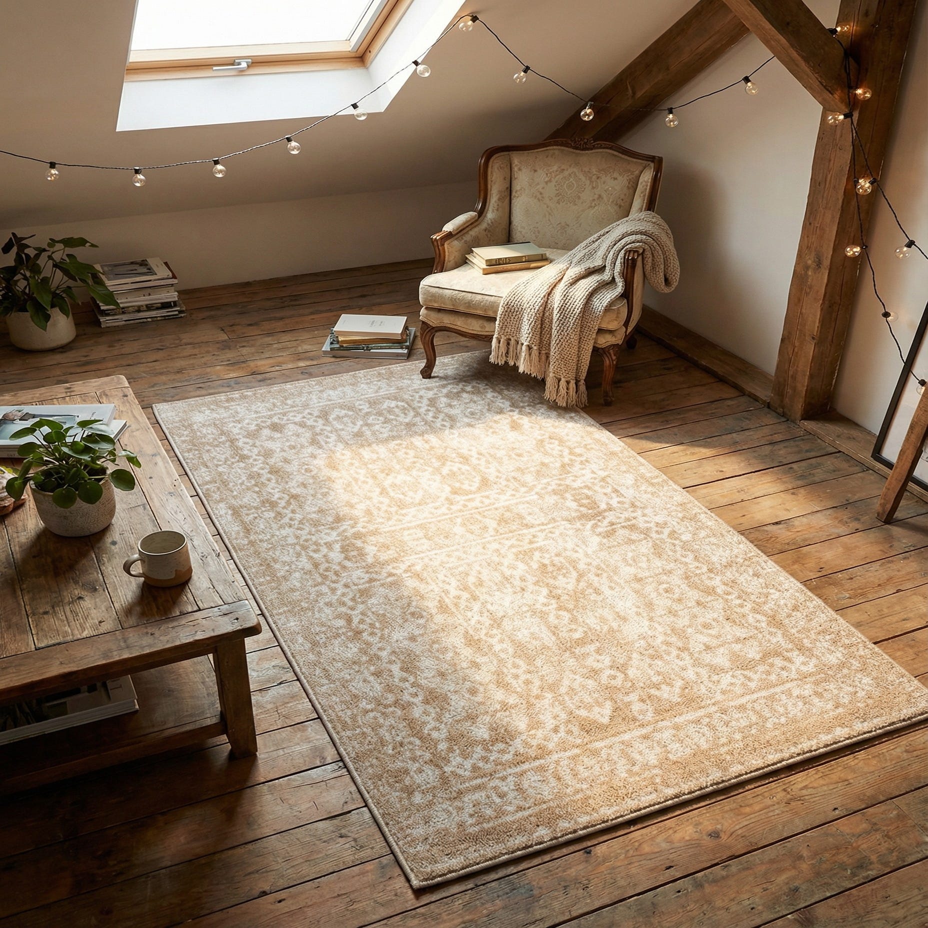 A soft, vintage-inspired pattern in ivory rests against a warm beige field, creating a quietly layered look with medallion panels and a subtle chain-like border. The design has a gently distressed finish that adds depth without strong contrast, and the low-pile construction gives a smooth, slightly plush hand that feels comfortable underfoot. Machine made from 100% polypropylene, the surface has a uniform texture that highlights the patterned areas while keeping the overall look airy and restrained.
