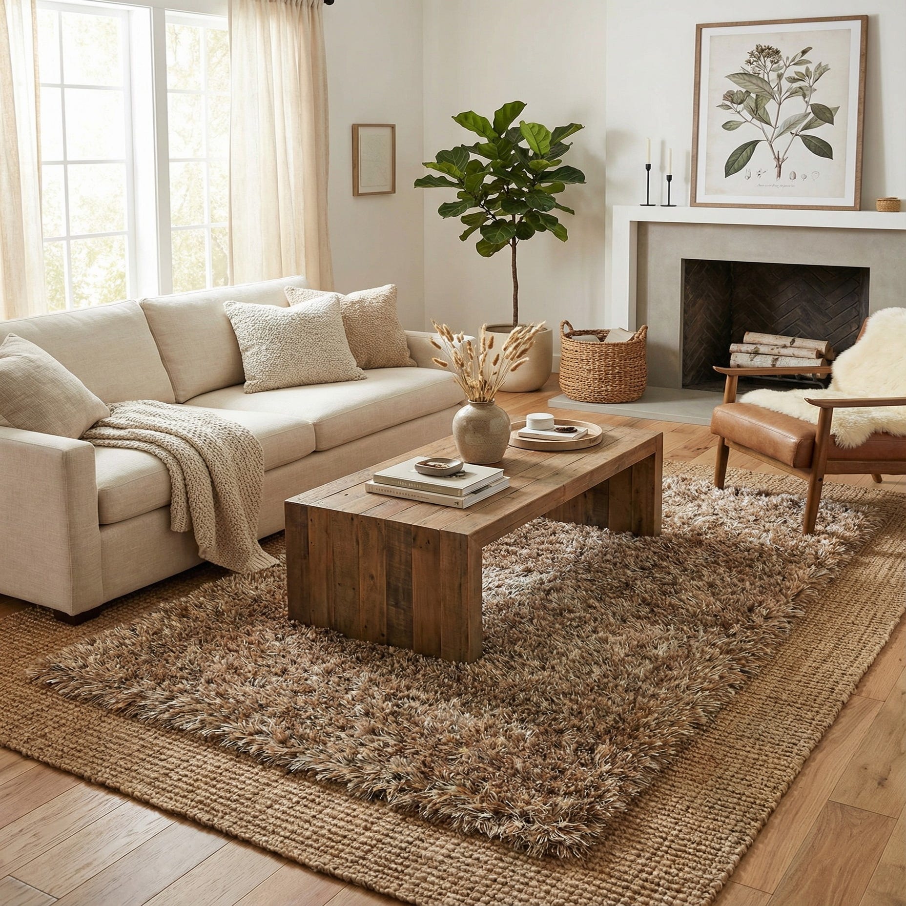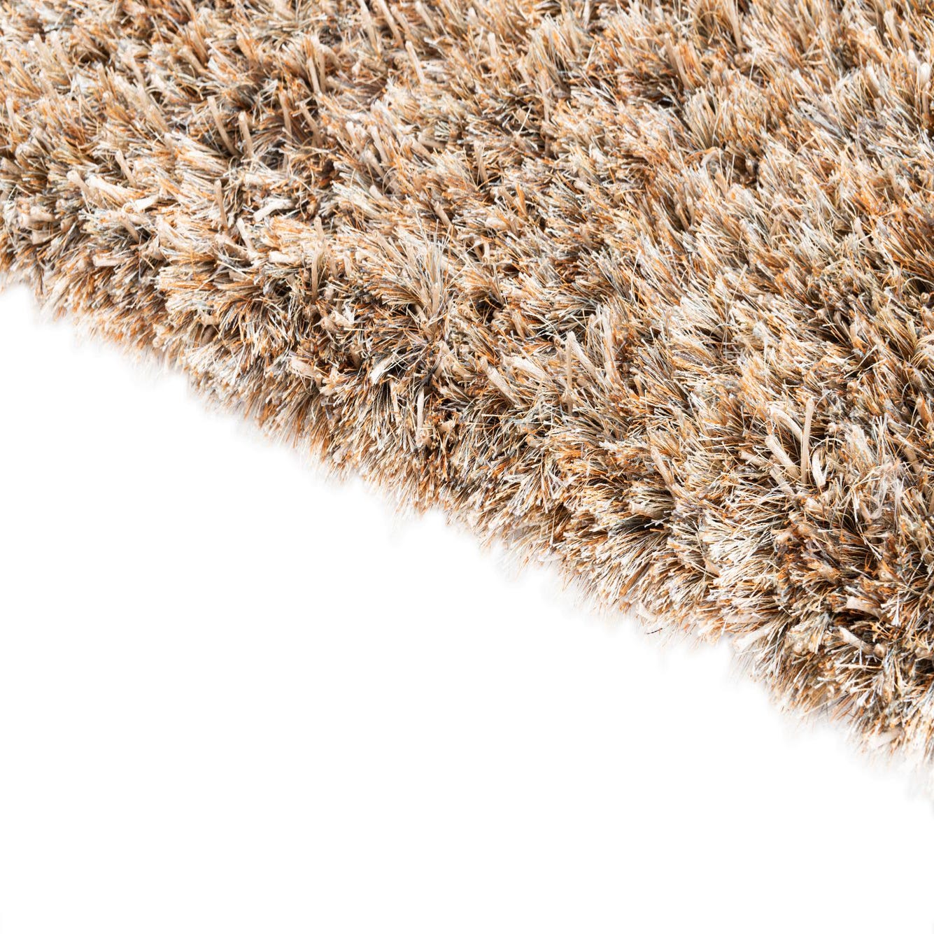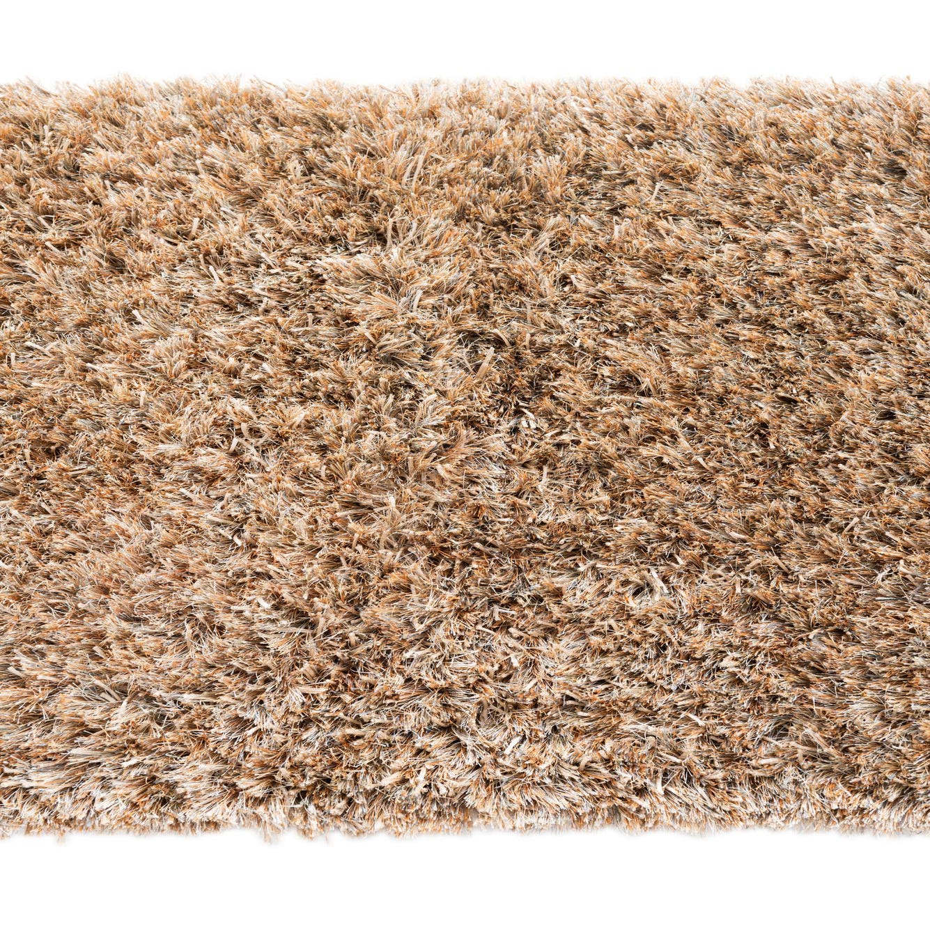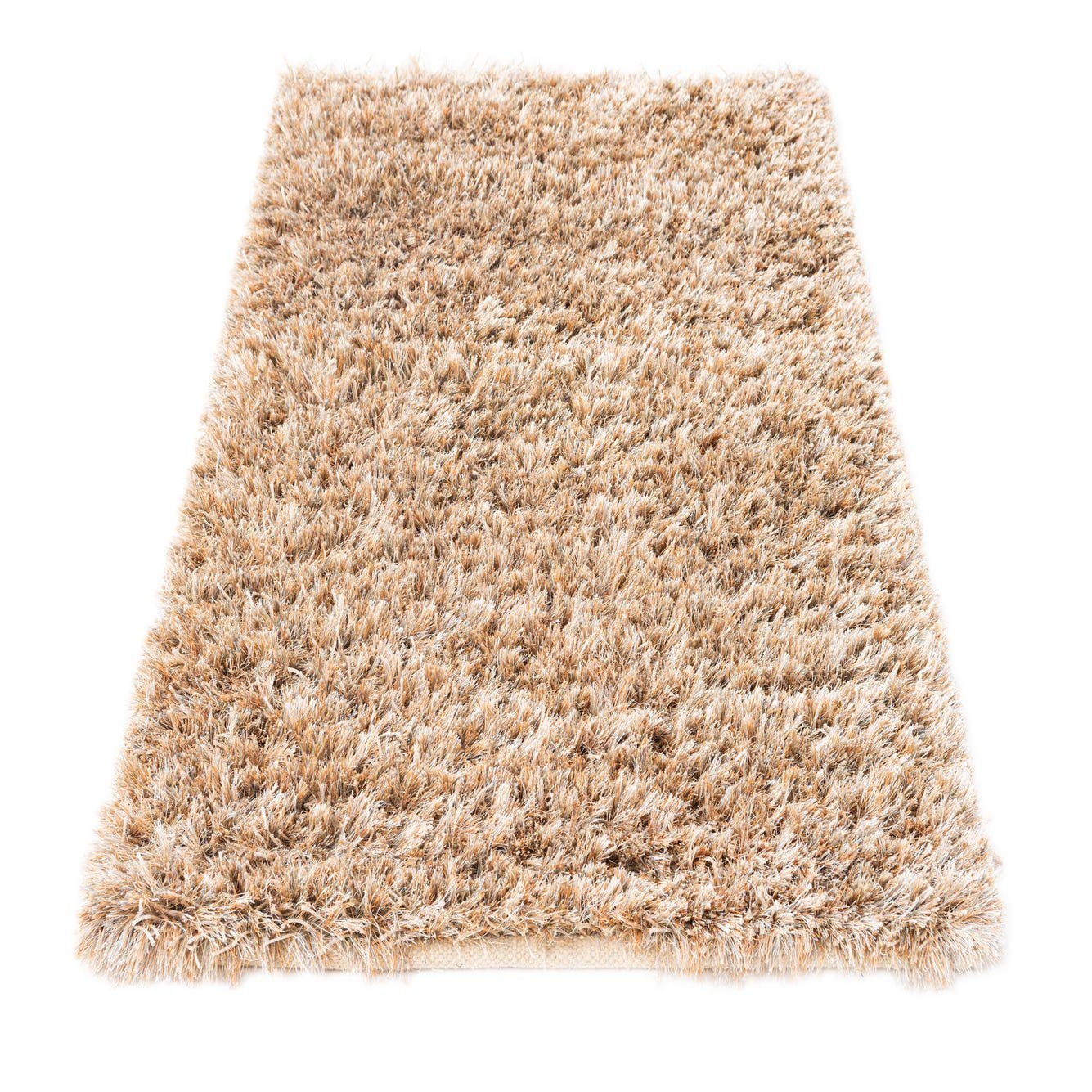 A 3x5 rectangular shag rug in varying shades of brown, tan, and cream, showcasing its plush, textured pile.