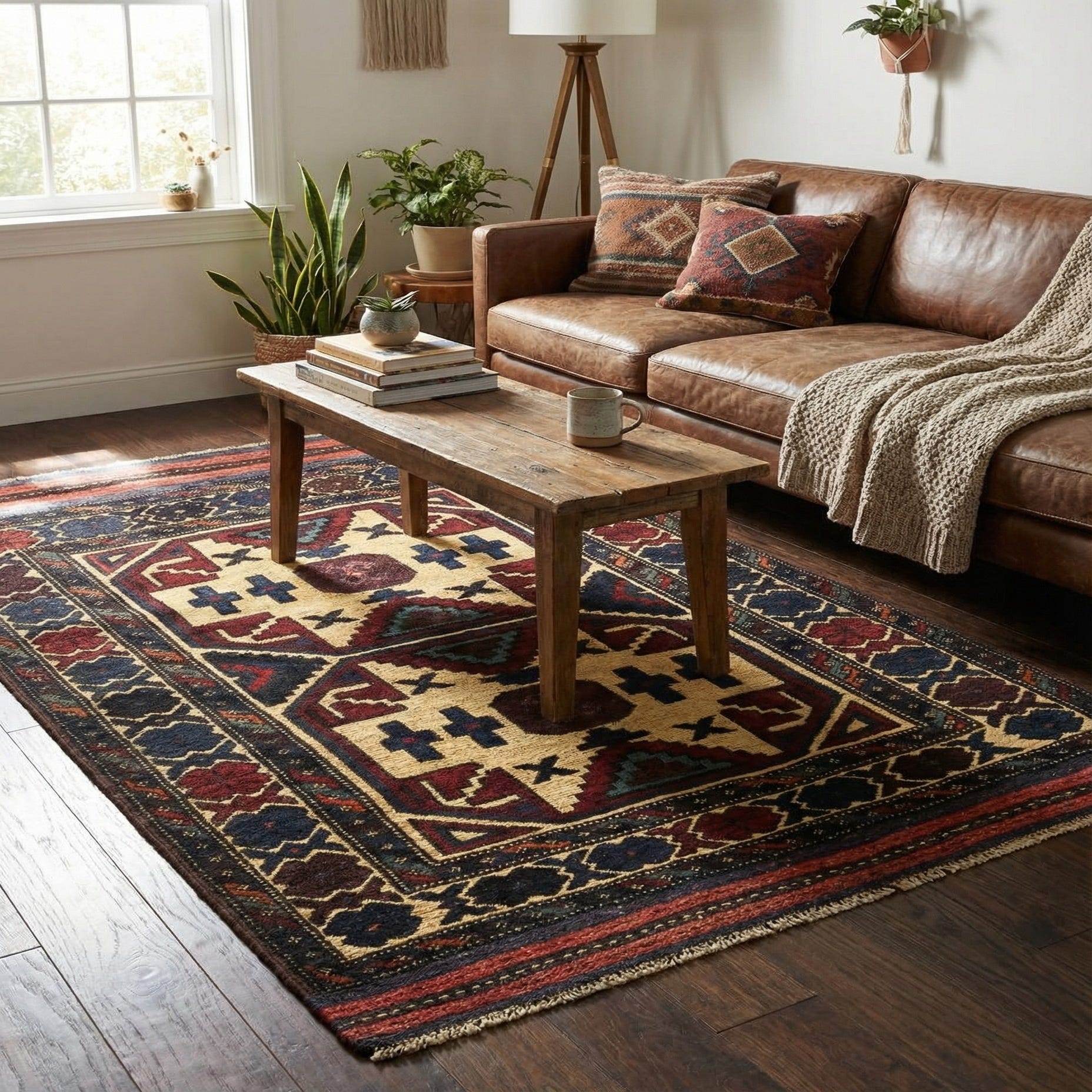 This rug works well in narrower or focused areas—an entry hall, a reading nook beneath a pair of chairs, or layered in front of a sofa to introduce pattern without overwhelming the room. It pairs naturally with warm wood furniture, leather upholstery, and muted painted walls, and complements traditional, rustic, or globally inspired interiors. Use it to add a grounded, patterned anchor to a neutral palette or to harmonize with other rich textiles and finishes.