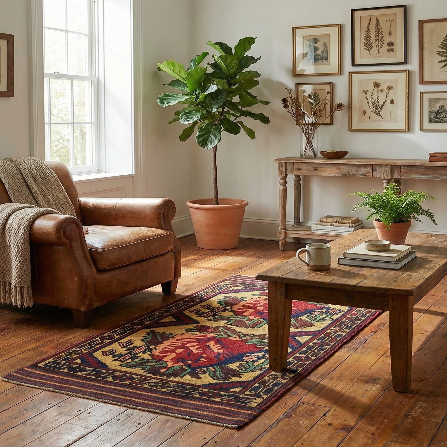 The Sumak rug's earthy tones and classic design make it versatile for various interior design scenarios. It could serve as an inviting piece in a traditional living room setting, or add warmth to a study or home office with classic wood furniture. Similarly, it has the potential to enrich a bohemian-style space with its intricate pattern and rich colors, or complement an eclectic mix of global-inspired decor. The rug's size also makes it particularly suitable for small to medium-sized rooms, where it can serve as a focal point or an accent piece without overwhelming the space.