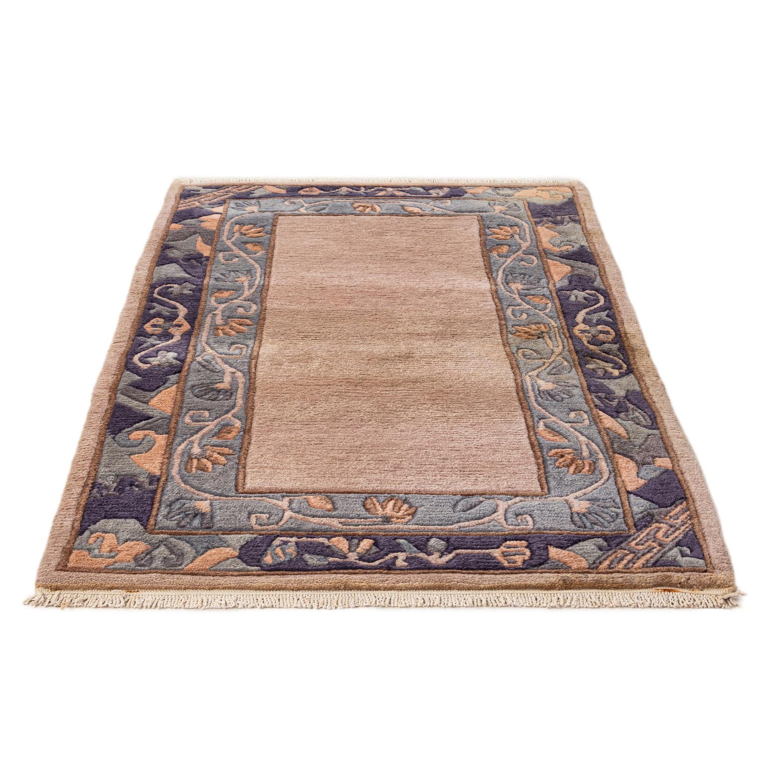 A 3x5 rectangular brown and ivory wool rug with a detailed Oriental border pattern in blue, purple, and orange.