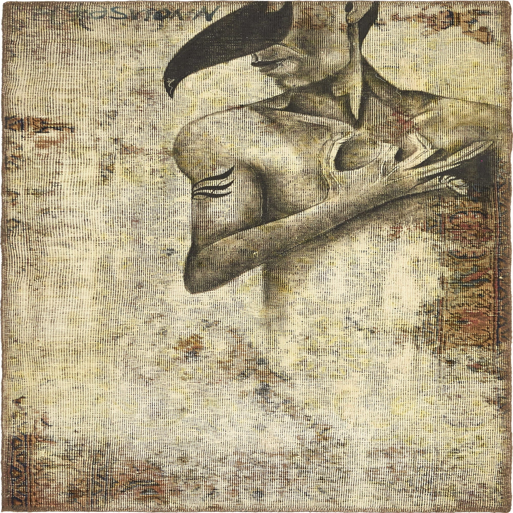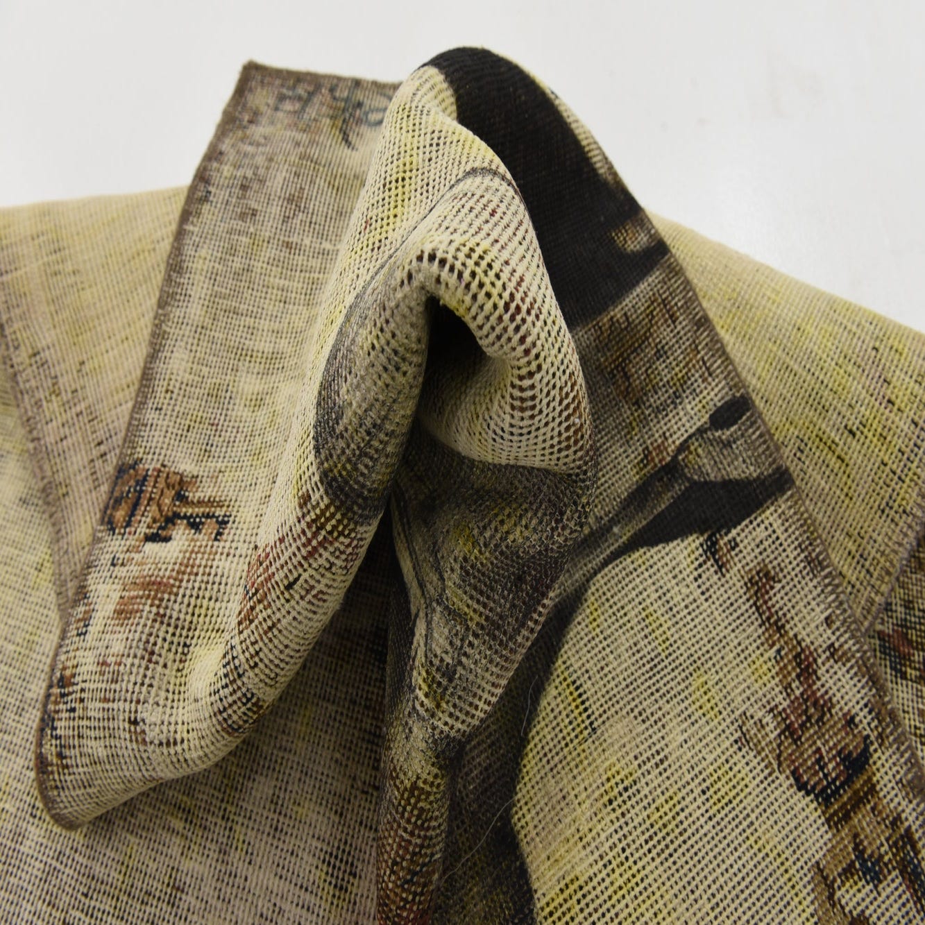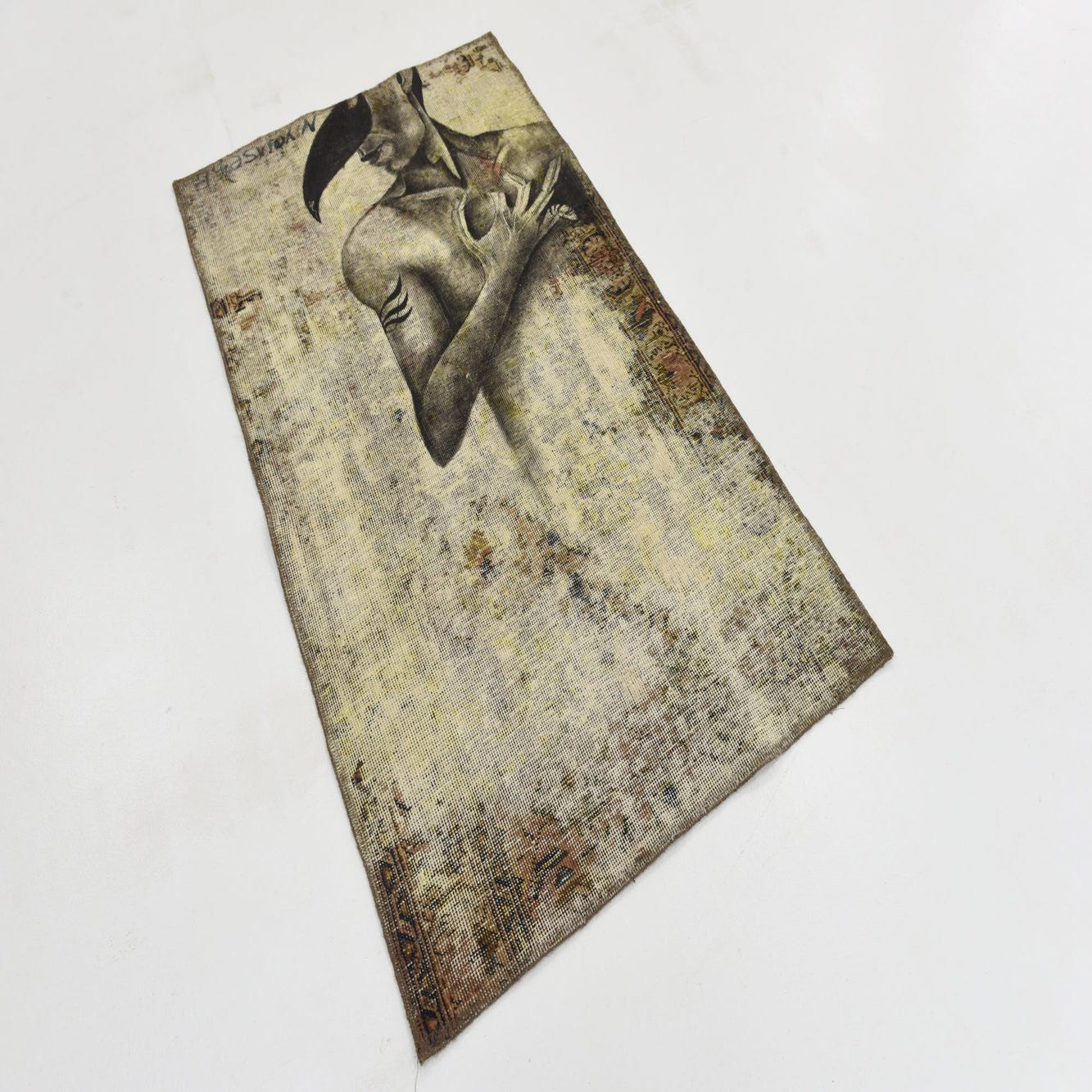 A soft beige field forms the backdrop for a deliberately worn, artful pattern in brown, gray and cream. The design combines faded figurative elements with scattered, antique-style motifs and a distressed border fragment that gives the rug an aged, gallery-ready look. The contrast between the muted browns and cool grays creates subtle depth while the cream highlights lift the composition, producing an understated, vintage-inspired aesthetic.