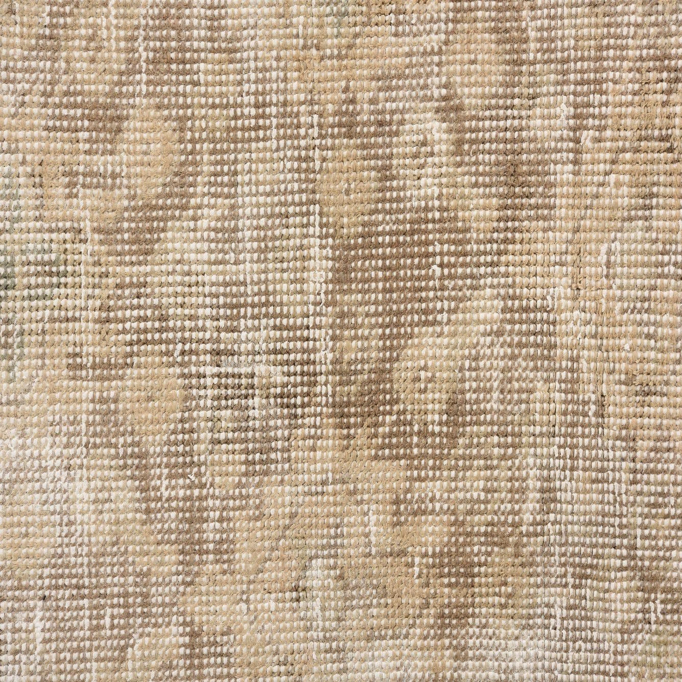 The design showcases a subtly distressed pattern, infusing a touch of antiquity into the piece. A versatile beige background is complemented by hues of brown, ivory, and green that lend it an earthy and warm palette. The presence of fringe on the ends adds a classic touch, enhancing the rug's overall sense of tradition.
