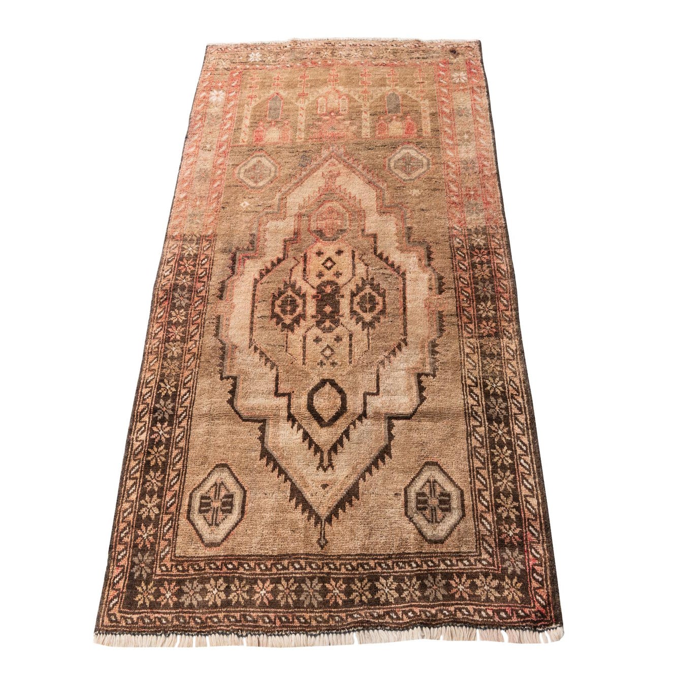 A rectangular 3x5 Ultra Vintage wool rug in browns, tans, and ivories, featuring a central medallion and Persian-inspired patterns.