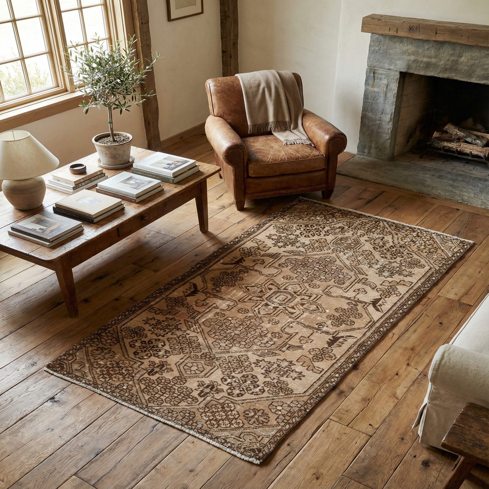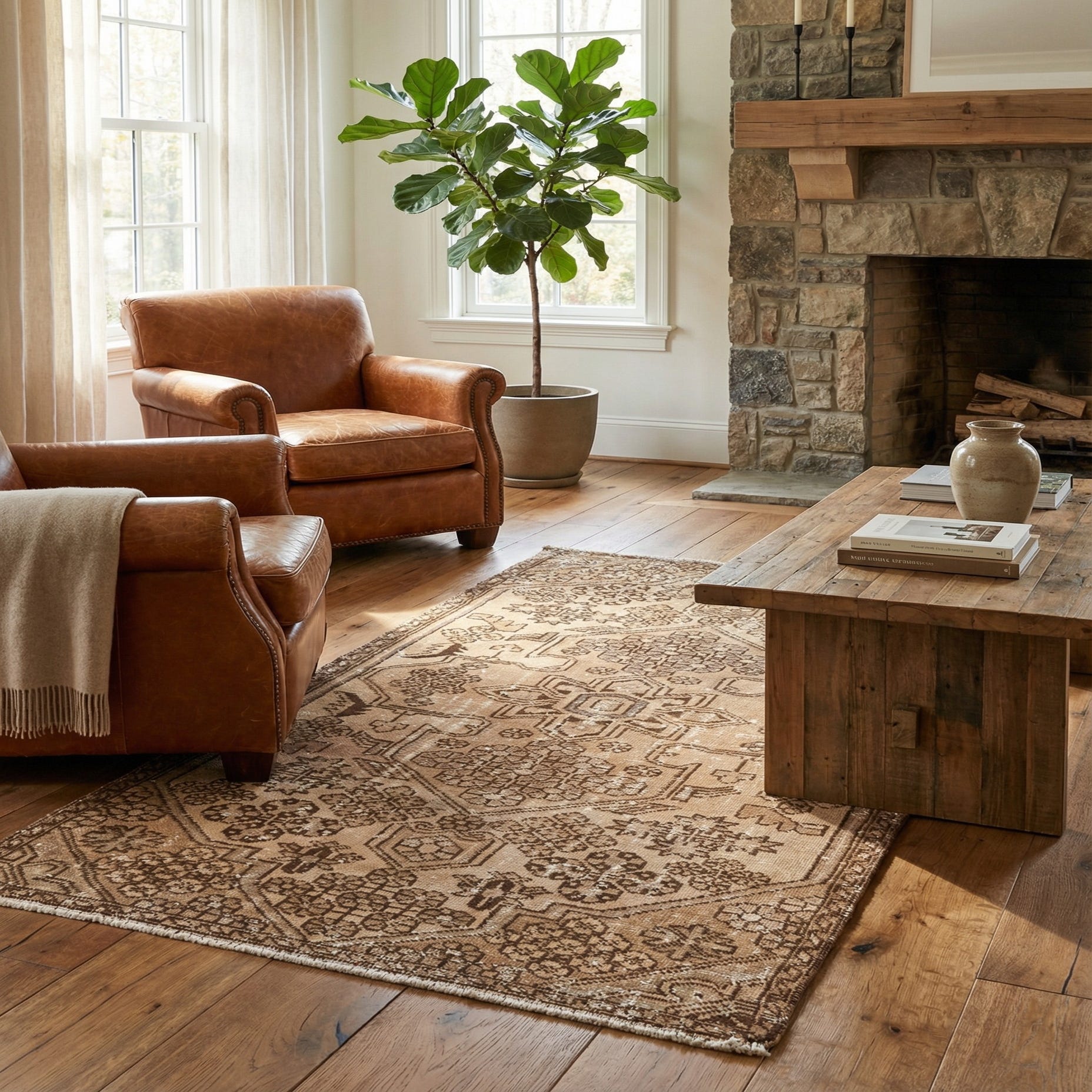 This rug works well in narrow entryways or hallways, layered in a living area, or placed at the foot of a bed to add warmth and quiet pattern. It pairs naturally with warm wood tones, leather seating, and neutral linens; try it in transitional or traditional settings where muted color and understated detail are desired, or in modern rustic and farmhouse interiors as a grounding, textural piece.