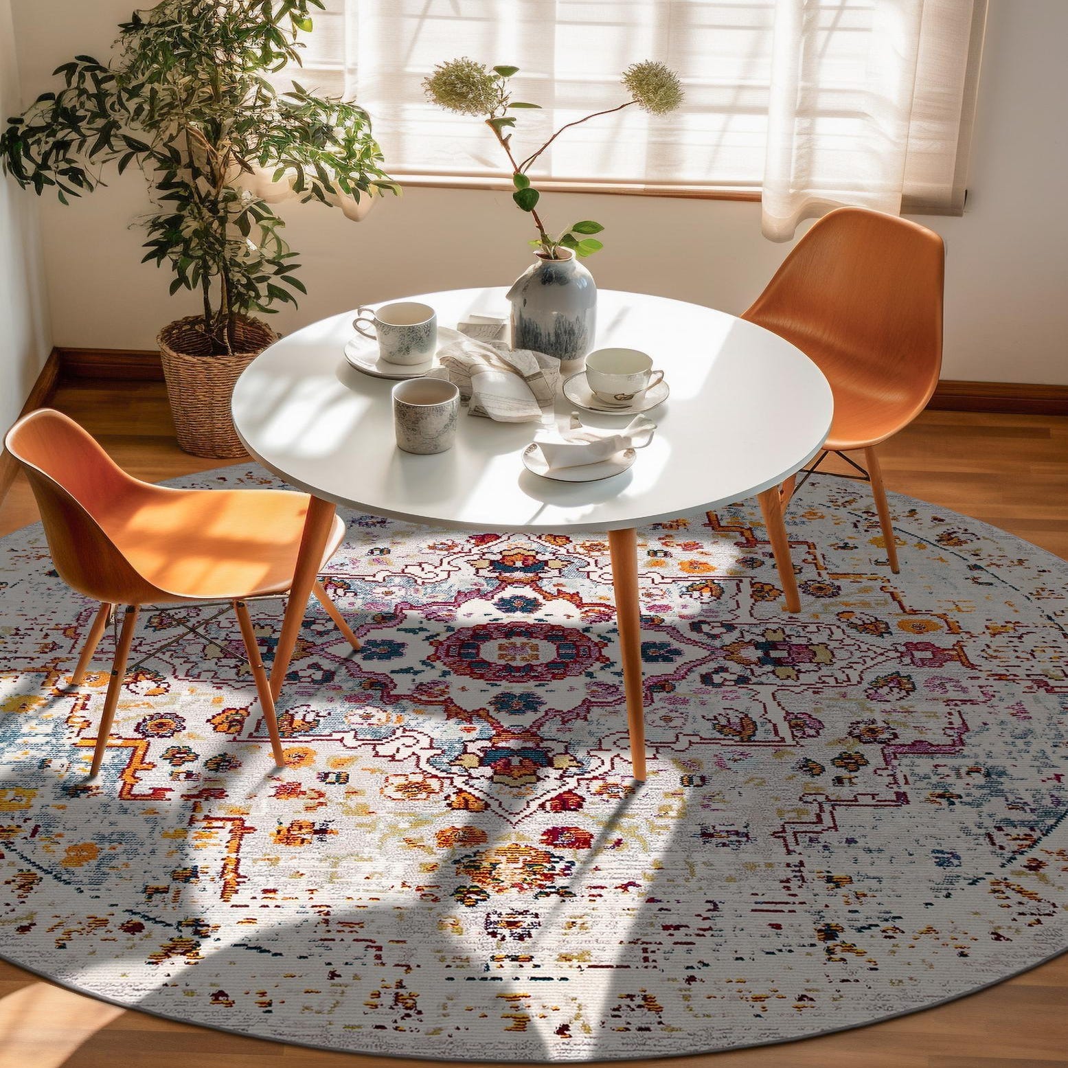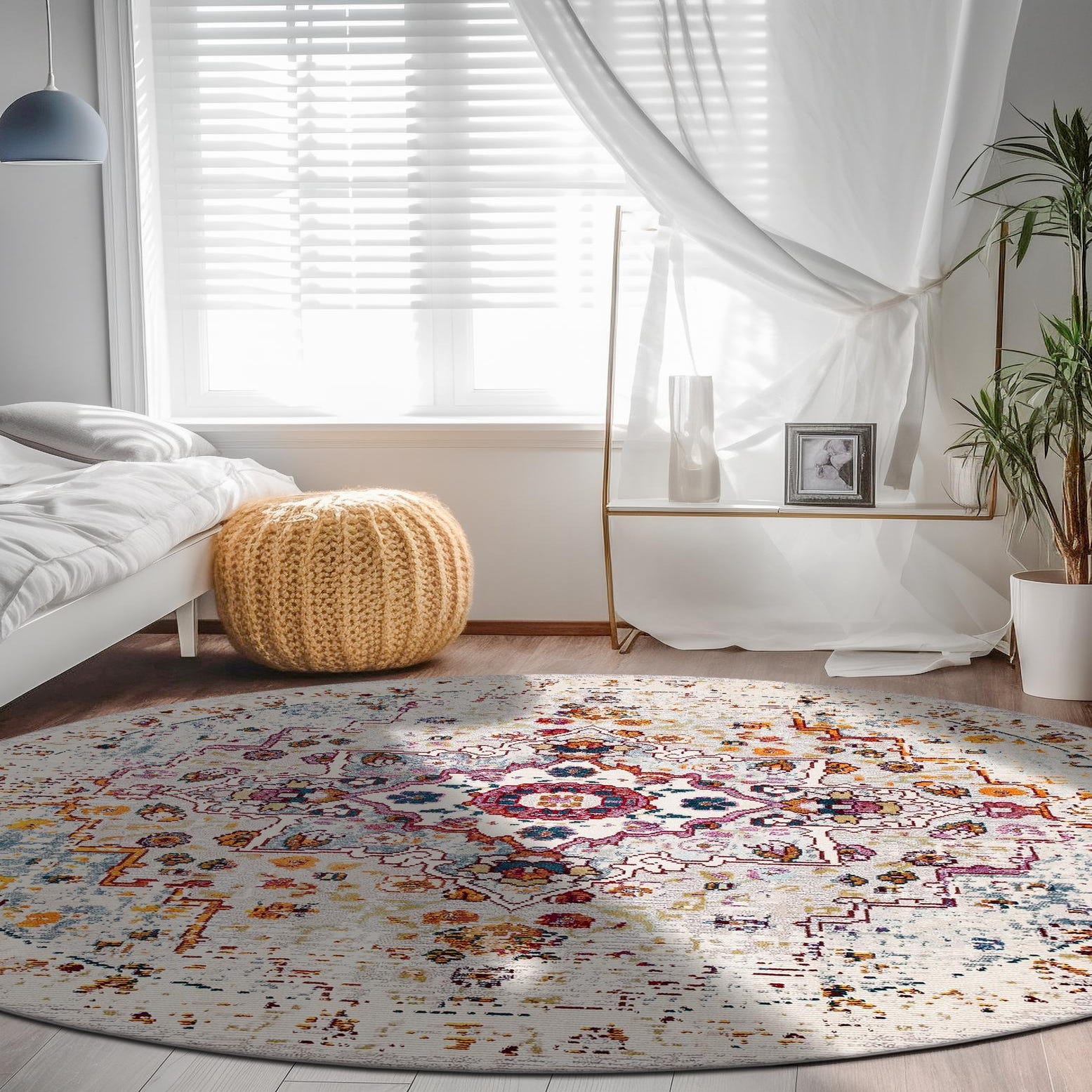 A 4' round Amulet rug with a distressed medallion pattern in vibrant reds, blues, oranges, and purples on an ivory background.