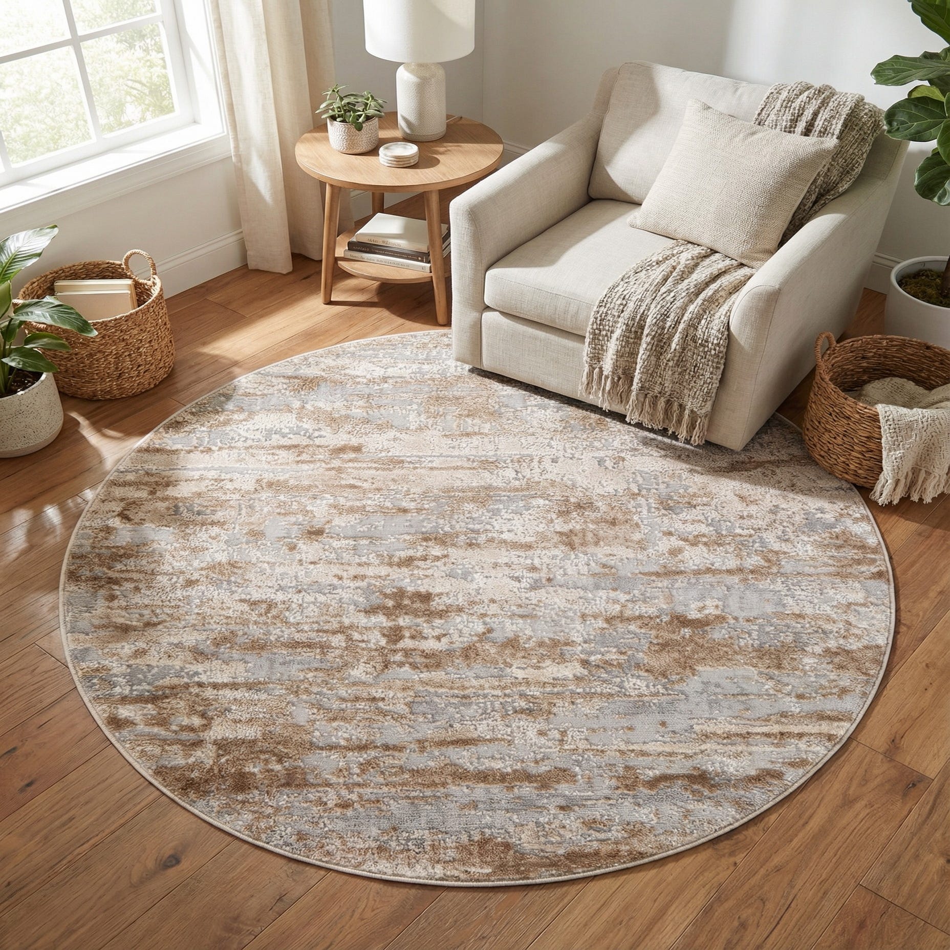 A round rug with a warm beige field and an abstract, painterly pattern in gray and ivory. Irregular streaks and mottled patches create a subtle, distressed effect that adds movement without a defined medallion or border. Machine-made from 60% polypropylene and 40% polyester, the surface has a low-to-medium pile with a soft, slightly velvety hand and a gentle sheen from the polyester yarns, giving the rug a layered, tactile presence underfoot.