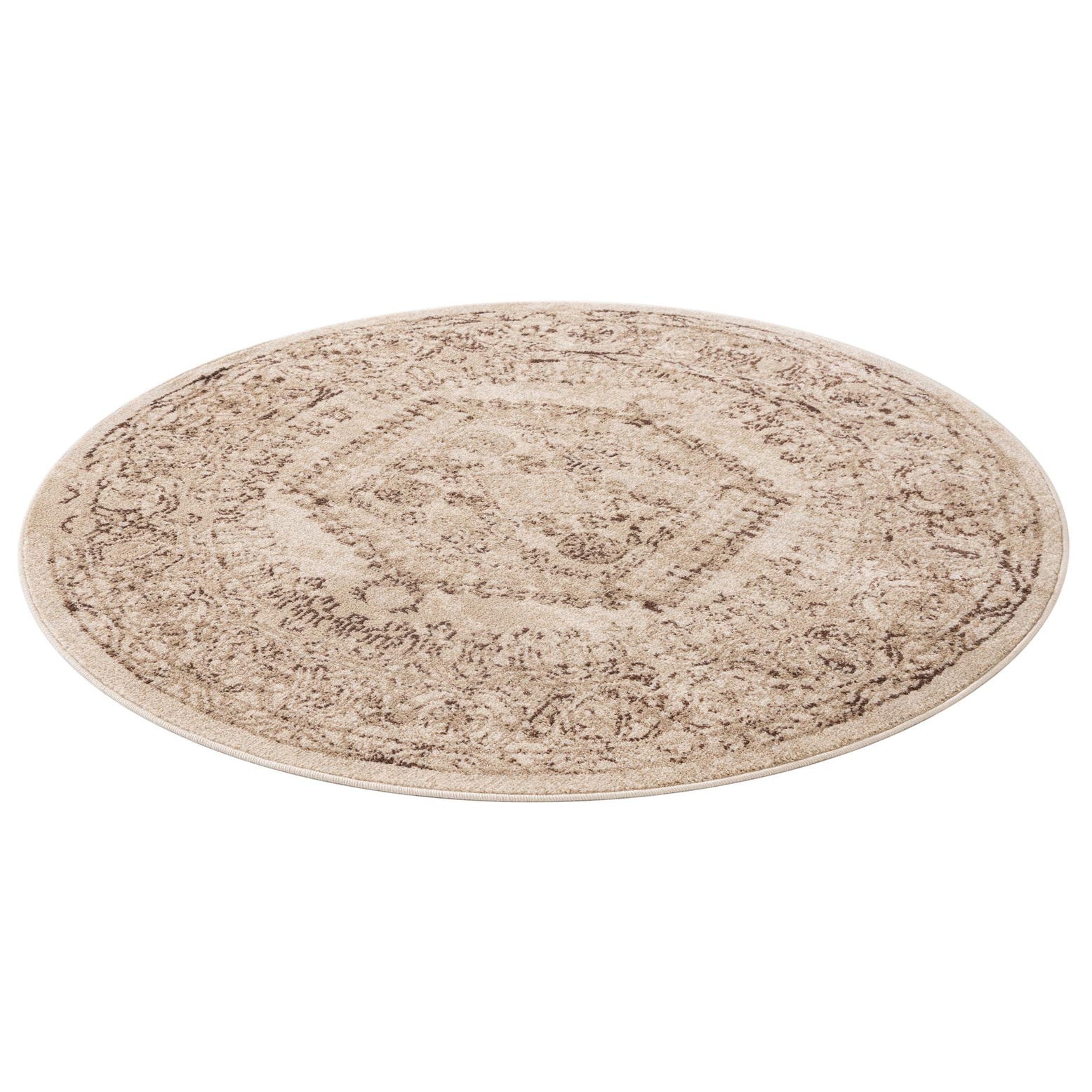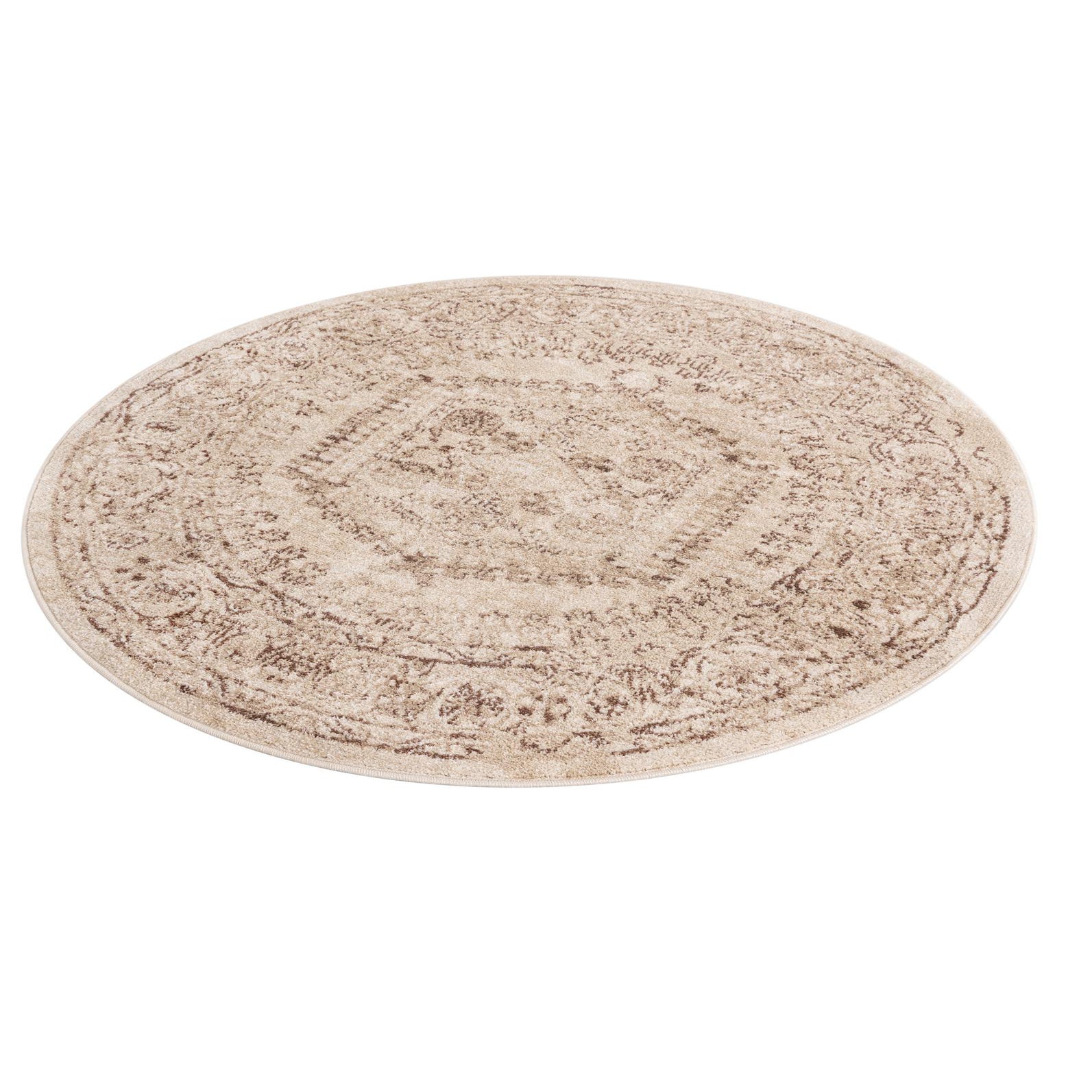 A soft, vintage-inspired medallion anchors this round rug, with a hexagonal center motif surrounded by an ornate floral-and-scroll border. The background is a warm beige, while cream and ivory highlights lift the pattern and brown accents define the detailing. Machine made from 100% polypropylene, the surface has a low, tightly woven pile that feels smooth and slightly dense underfoot, offering a subtle textural contrast without heavy loft.