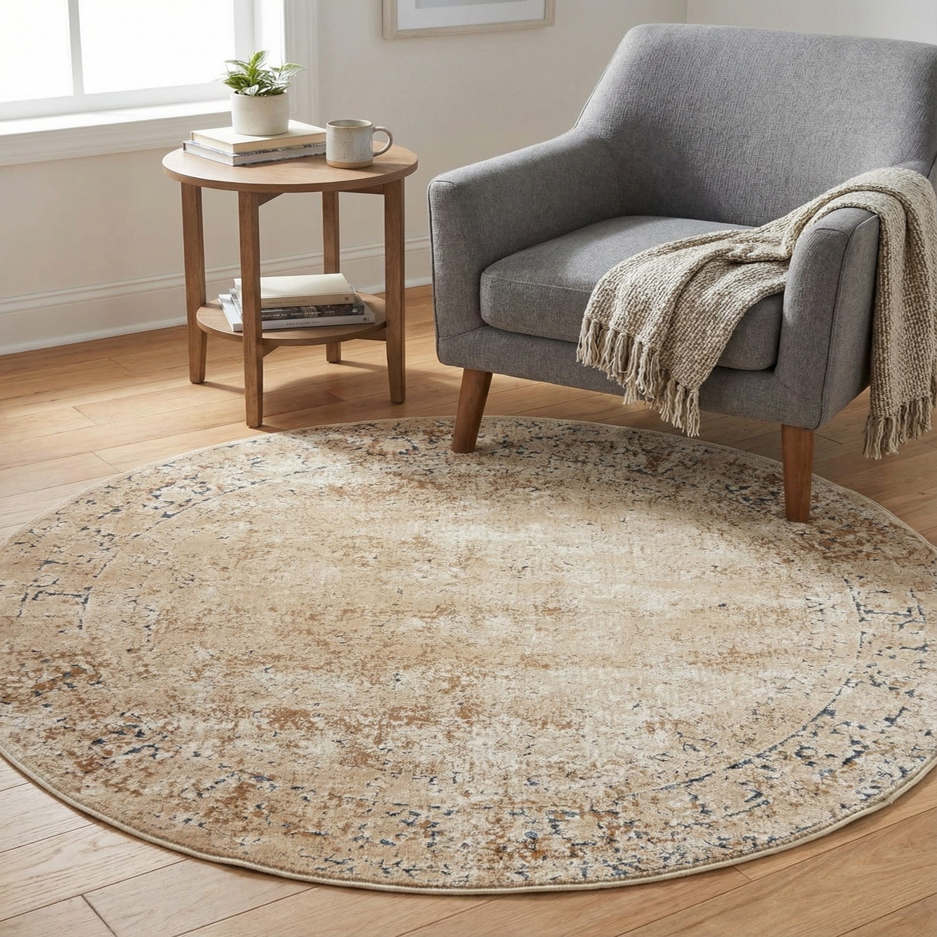 This round rug fits naturally in relaxed, transitional interiors. Place it beneath a small coffee table to warm a neutral living room, anchor a bedroom seating nook for added comfort underfoot, or center it in a casual dining or entry area to soften wood and woven furnishings. Its neutral palette pairs well with light woods, rattan, soft linens, and muted upholstery, bringing a calm, textured foundation to a variety of decor schemes.