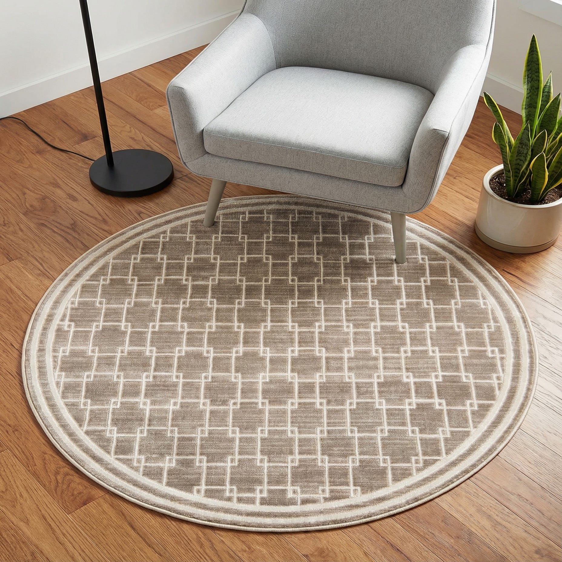 Neutral beige provides a warm foundation for a crisp ivory geometric lattice, where interlocking squares and stepped lines form a modern, rhythmic pattern. A subtle double-ring border defines the round silhouette and adds a finished look. Machine-made from 70% polypropylene and 30% polyester, the low, slightly plush pile has a soft hand and a gentle sheen that feels smooth underfoot while keeping the pattern clearly defined.