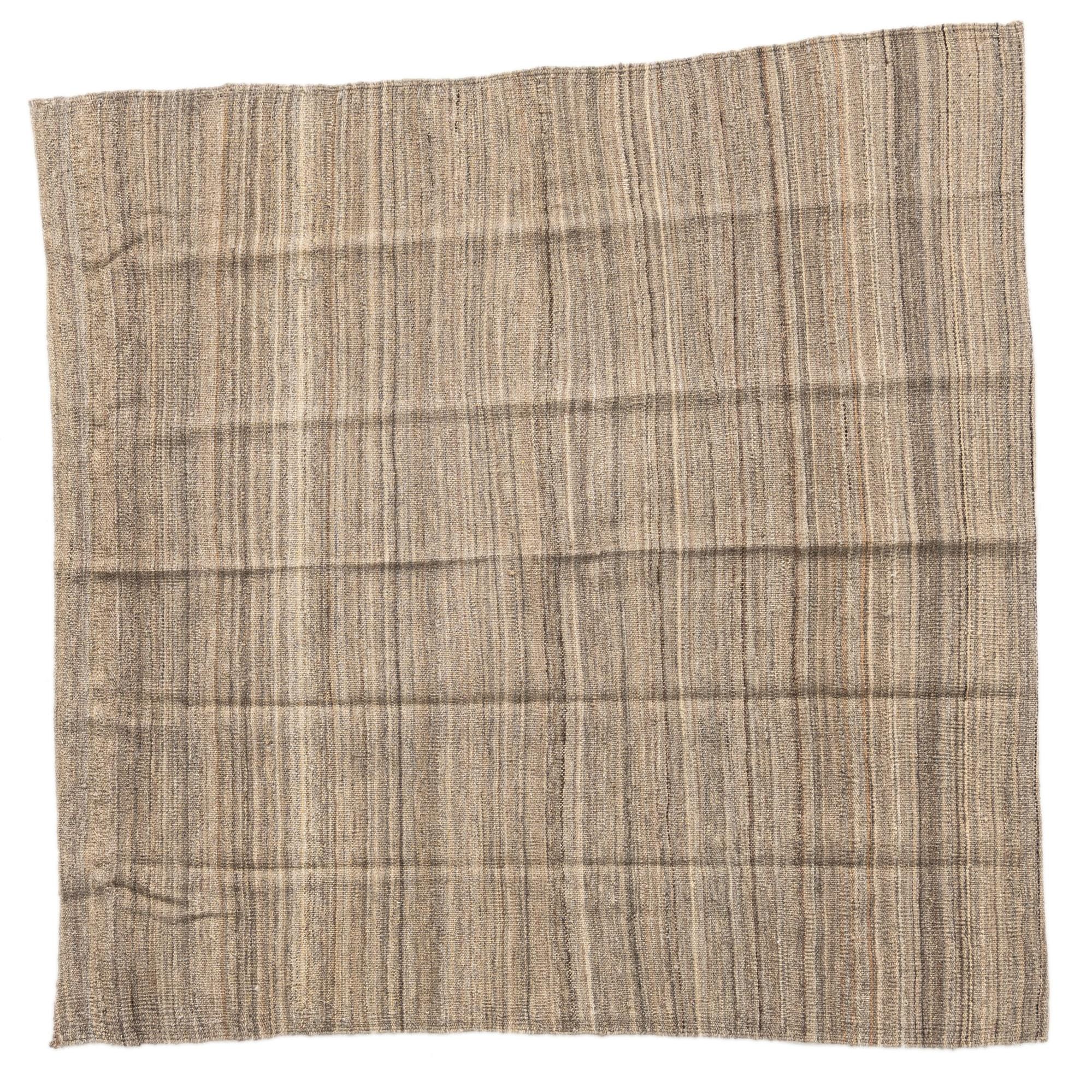 A 3' 10 x 3' 11 square Kilim Modern wool rug featuring a tribal striped pattern in browns, tans, and ivories.
