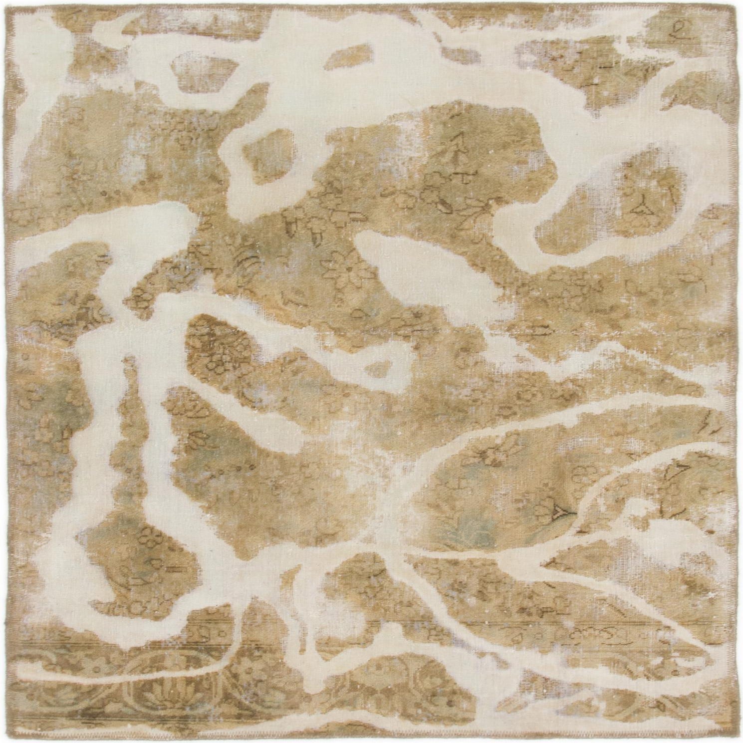 A 3' 10 x 4' 9 square brown and ivory Persian rug with an abstract, distressed pattern, suitable for an indoor living space.