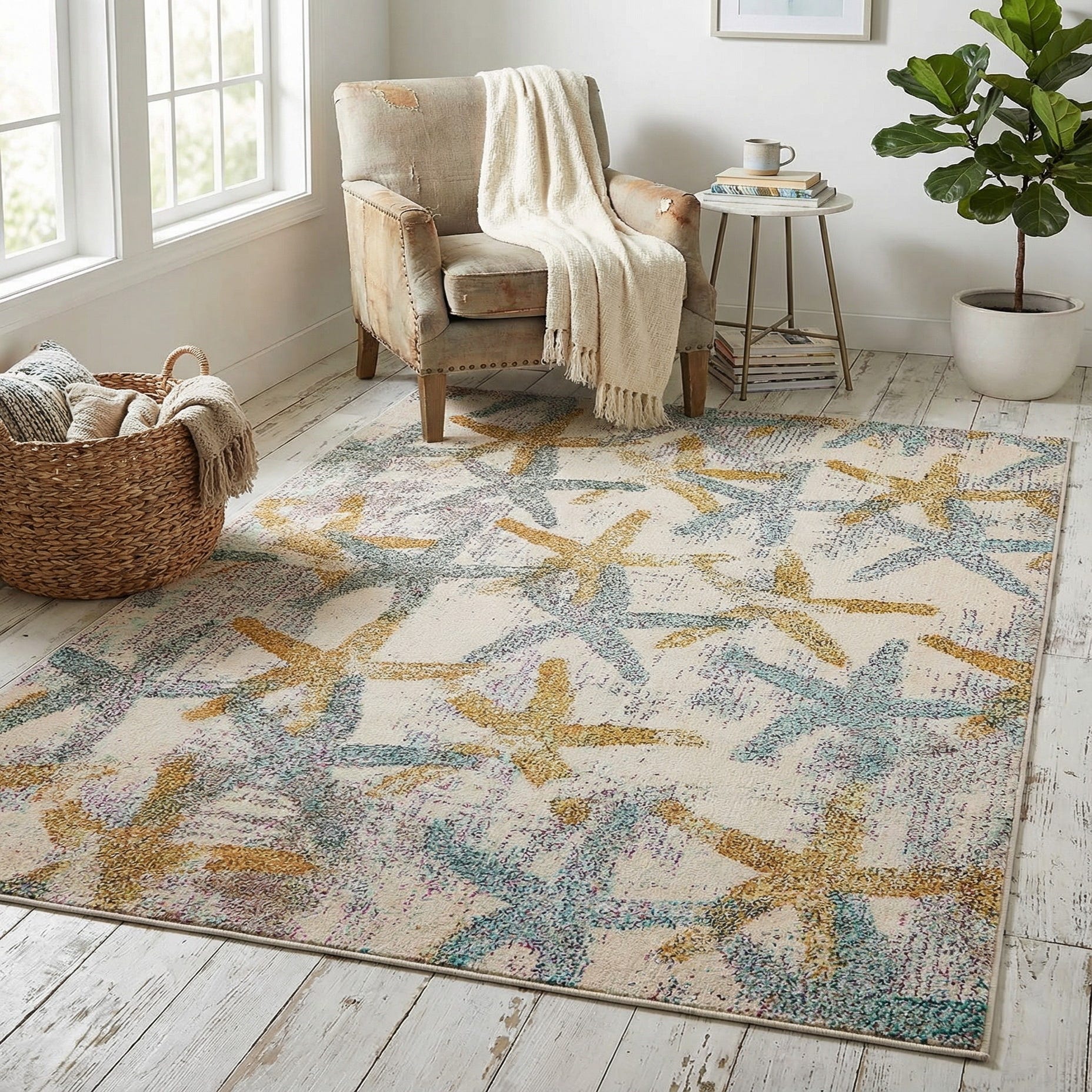 A scattering of overlapping starfish sweeps across a beige ground, rendered in soft blue, warm gold, muted gray and small touches of red. The pattern has a painterly, slightly distressed finish with subtle striations and color flecks that create visual depth without overwhelming a room. Underfoot the surface reads as low-pile and comfortably textured, the design giving the rug a casual, coastal-meets-contemporary look.