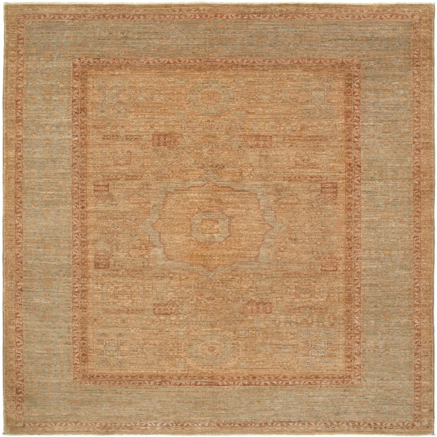 A 4x6 rectangular Persian rug with a tan and brown central medallion and a light blue-green border.