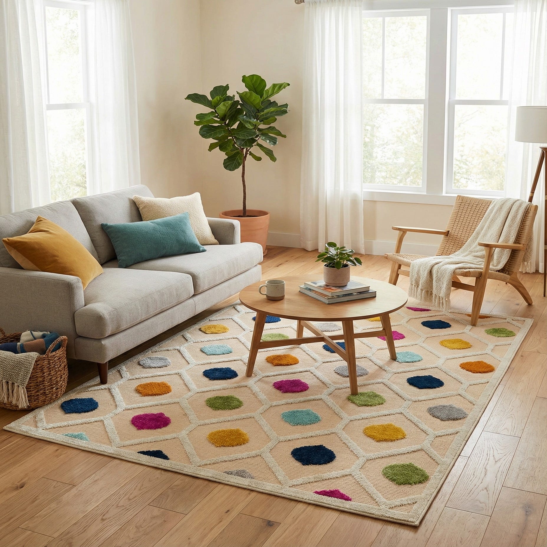Primary color is Beige. Colors in this rug include: Beige, Black, Green, Light Blue, Orange, Yellow, Pink.
