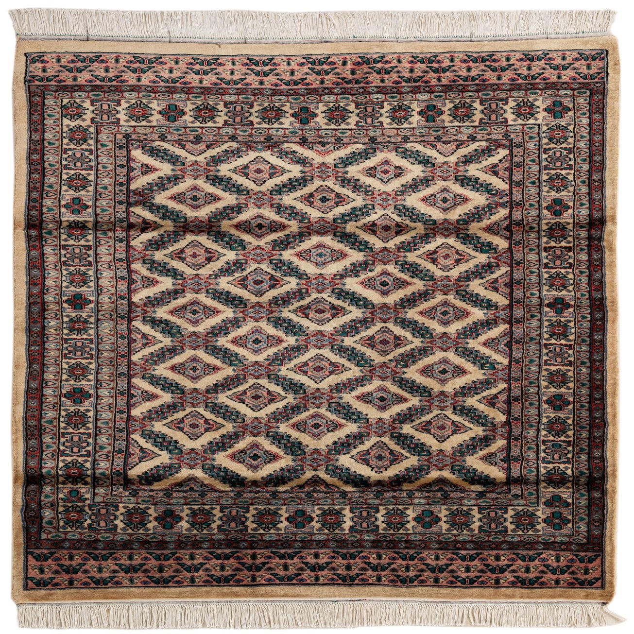 A 4x6 rectangular Bokhara wool rug featuring a traditional tribal pattern in ivory, tan, and brown with intricate red and teal diamond motifs.