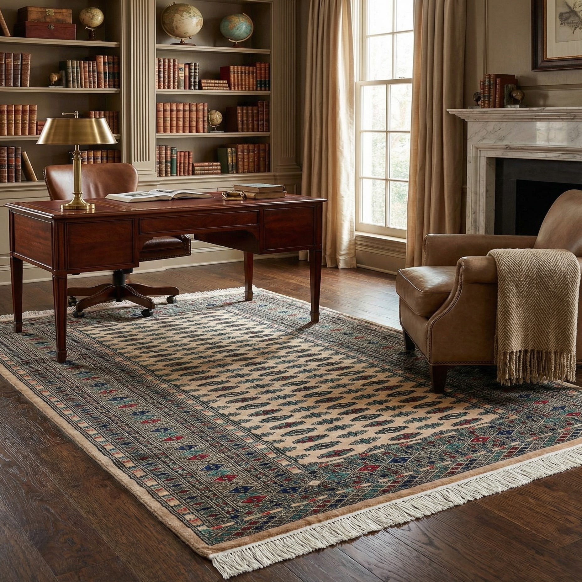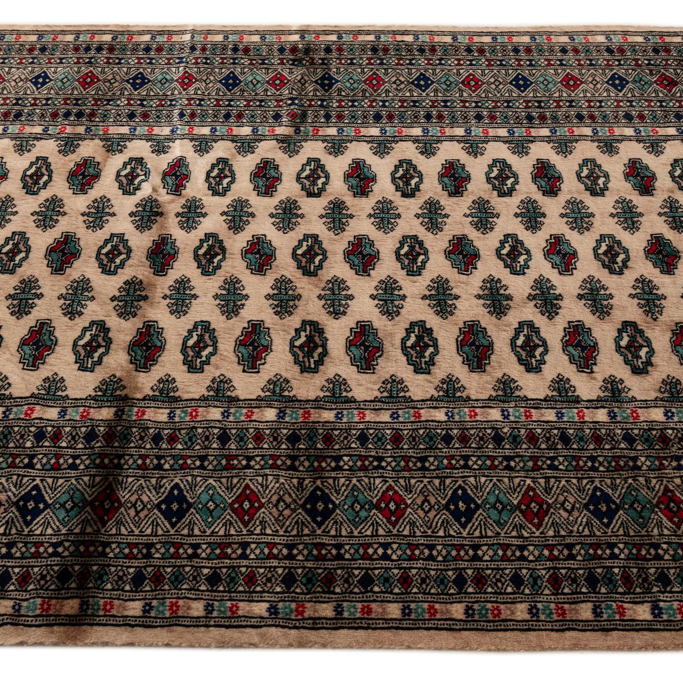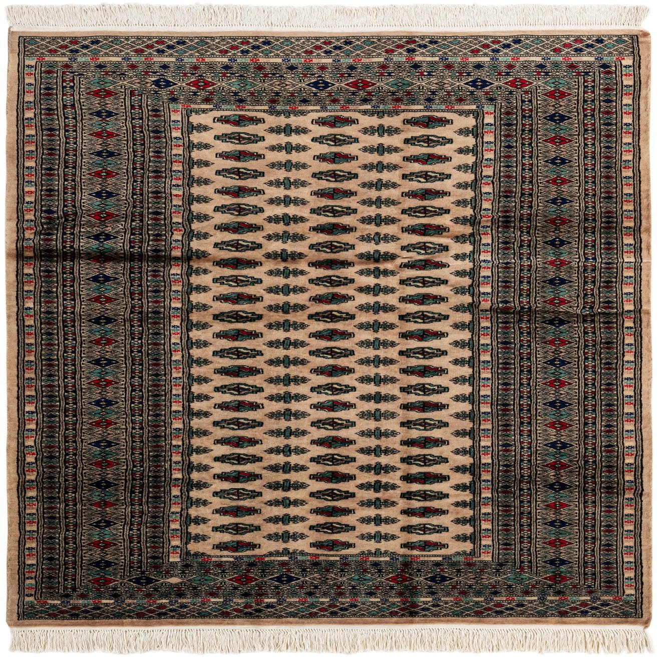 A 4x6 rectangular Bokhara wool rug with a tan field, featuring traditional tribal motifs in red, blue, and green, and a detailed border.
