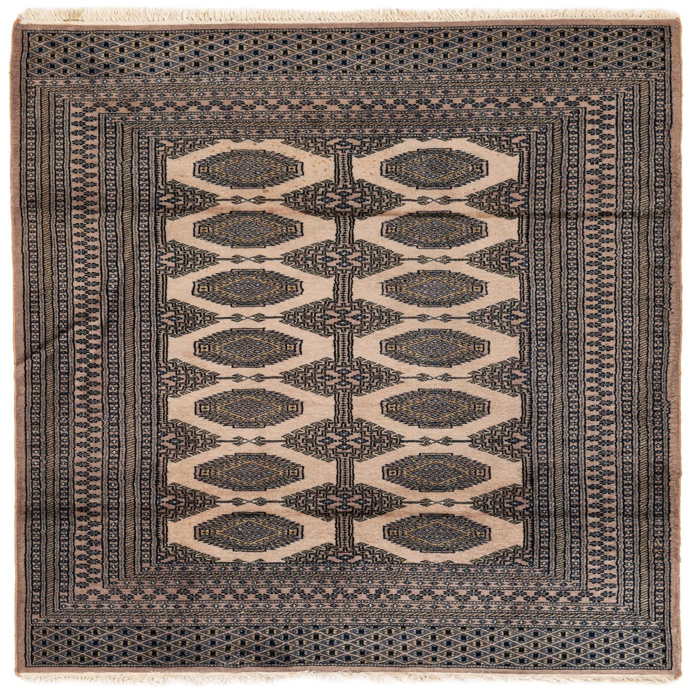 A 4x6 rectangular Bokhara rug featuring a traditional tribal pattern in shades of brown, tan, and cream.