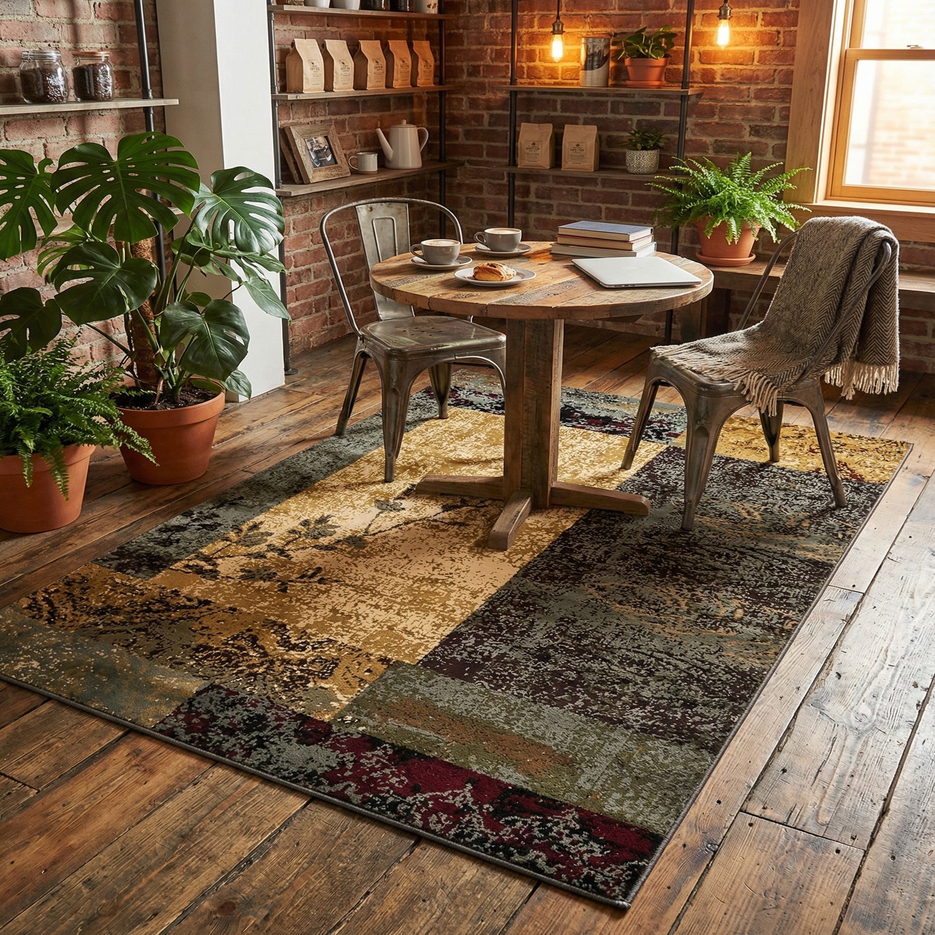 Machine-made from 100% polypropylene, the surface has a low-profile, softly textured finish that feels smooth underfoot and shows color variation with the cut-and-loop construction. This rug suits a range of interiors — place it beneath a coffee table in a relaxed living room, in an entry or hallway to add visual interest, or under a small dining table paired with warm wood furniture. It pairs well with neutral sofas and gray or navy walls, and adds a cozy counterpoint to leather or mid-century modern pieces when you introduce accent pillows in burgundy or olive.