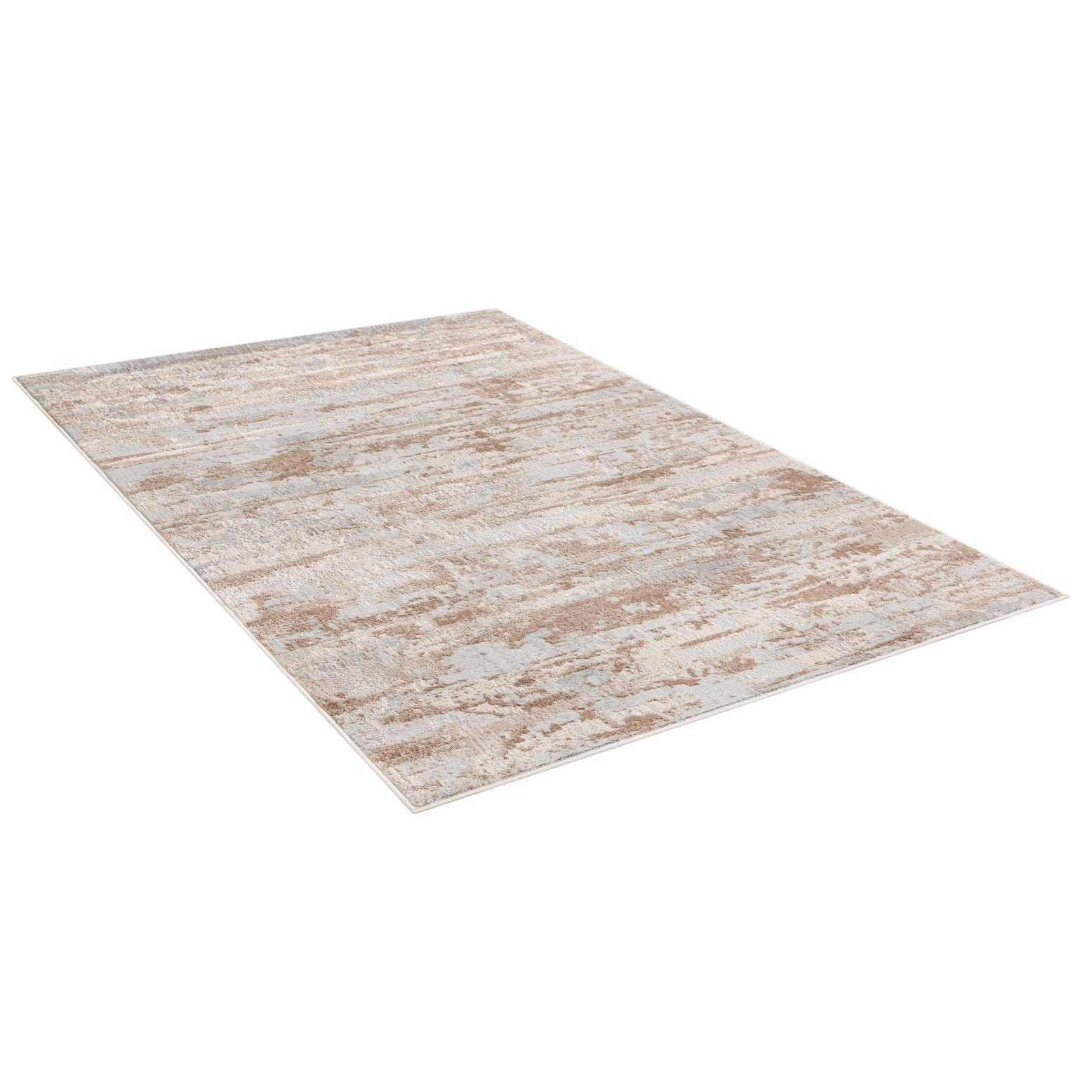 A soft beige field sets the stage for a painterly, abstract pattern of gray and ivory that moves across the surface in layered, horizontal striations. The design balances weathered texture with clean color transitions, giving the rug a contemporary-transitional look that complements both modern and more relaxed interiors. Neutral tones dominate without overwhelming, so the piece anchors a space while letting furniture and textiles take center stage.