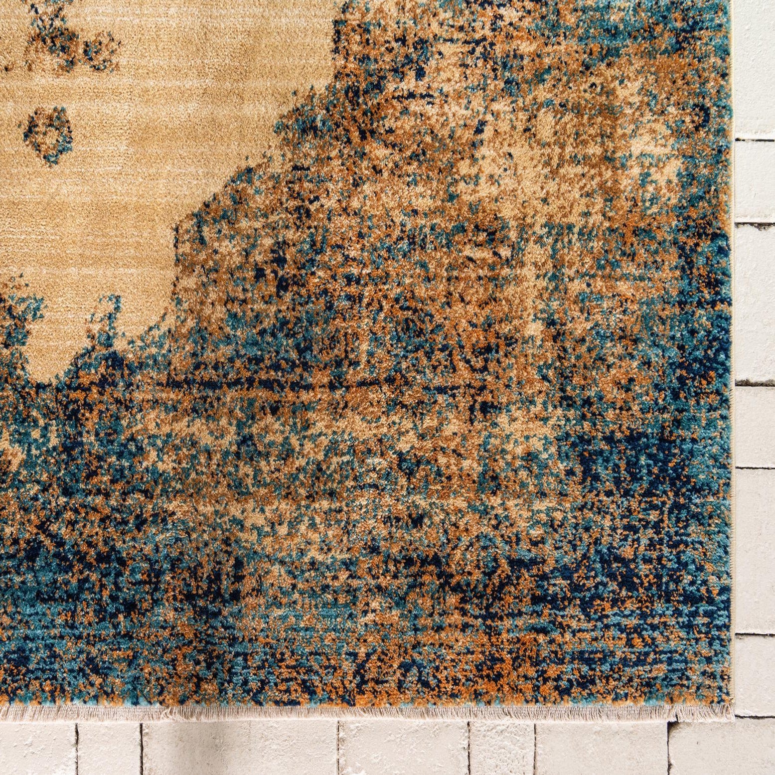 Place this rug to add grounding color in a small living area, entryway, home office, or at the foot of a bed. It pairs naturally with warm wood tones and navy upholstery for a cohesive look, or it can sit beneath a neutral sofa to bring color without overwhelming the room. The blend of beige, black, blue, gold and navy blue complements modern farmhouse, coastal, and transitional interiors and works well with mixed metals, layered textiles, and casual vintage pieces.
