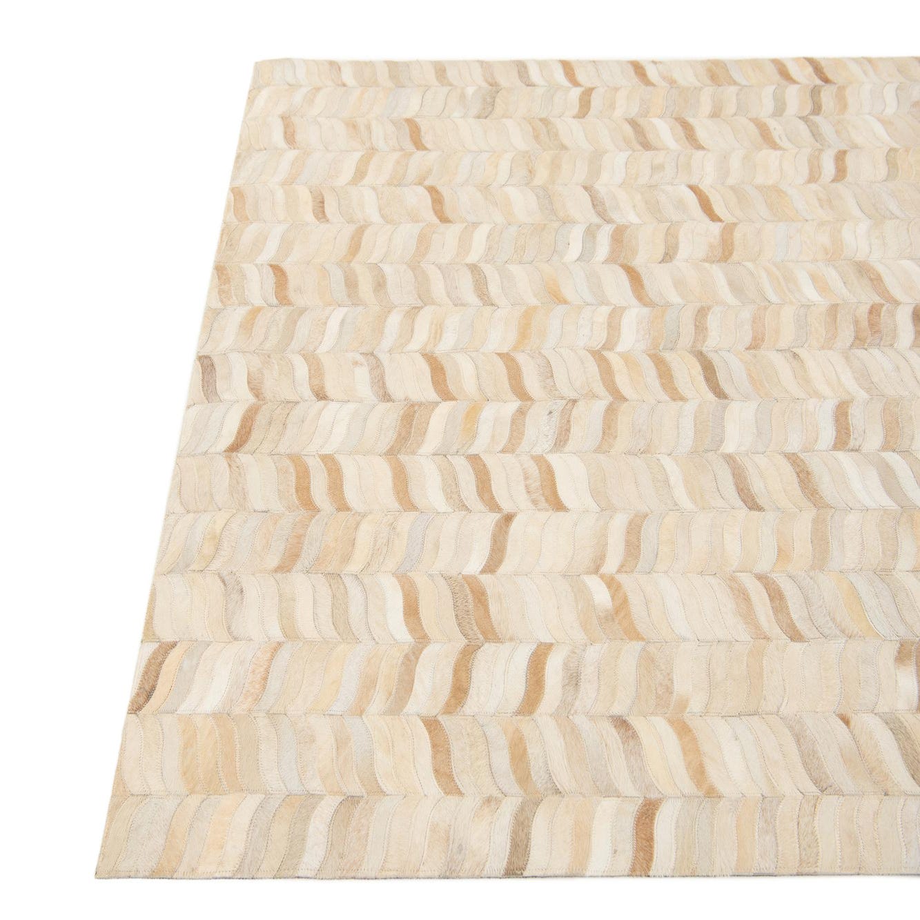 A 4x6 rectangular Cowhide Stocks rug featuring a modern chevron pattern in varying shades of brown, tan, and ivory.