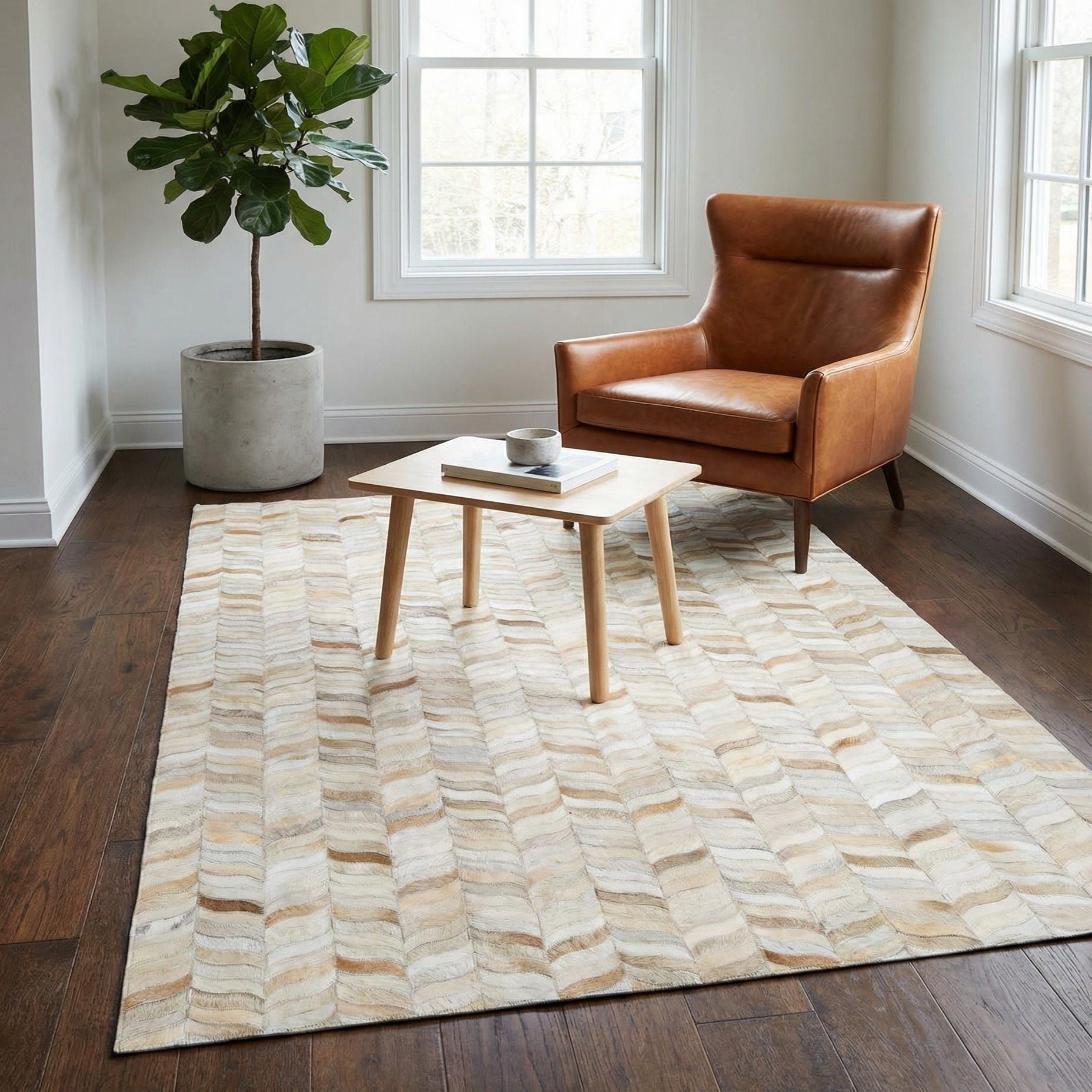 Soft, tactile panels of cowhide and leather form a flowing chevron motif that runs in narrow vertical columns across a beige background. Each leaf-shaped patch alternates between ivory, tan and subtle gray, creating a layered, organic rhythm while the natural hair-on-hide surface adds a gentle sheen and light nap. Hand made of cowhide and leather, the piece has visible stitching lines and slightly raised seams that give the rug a crafted, dimensional feel underfoot.