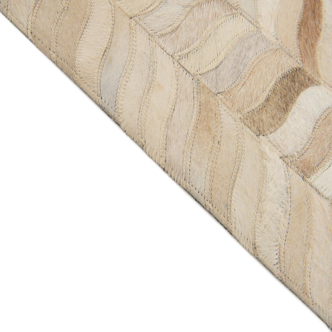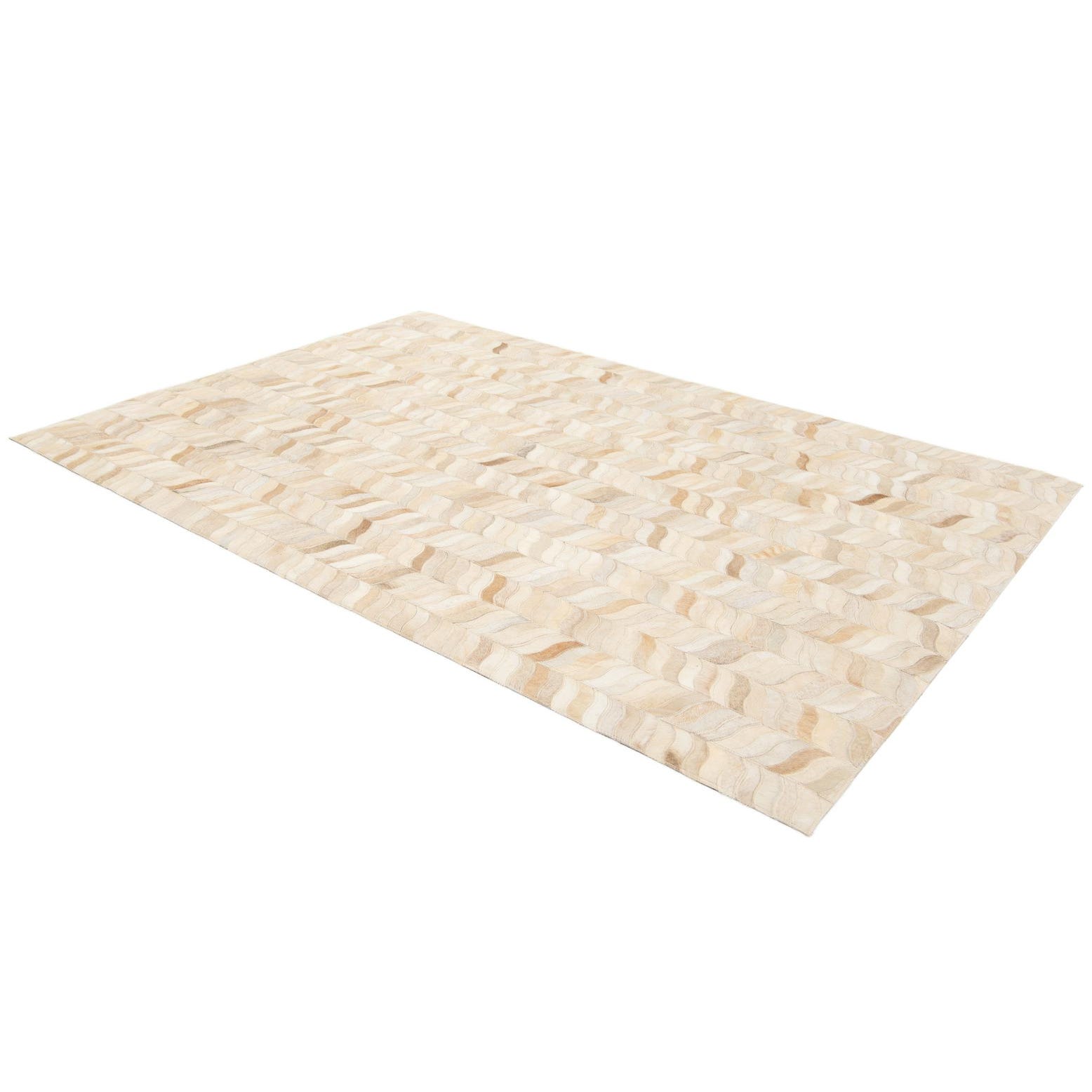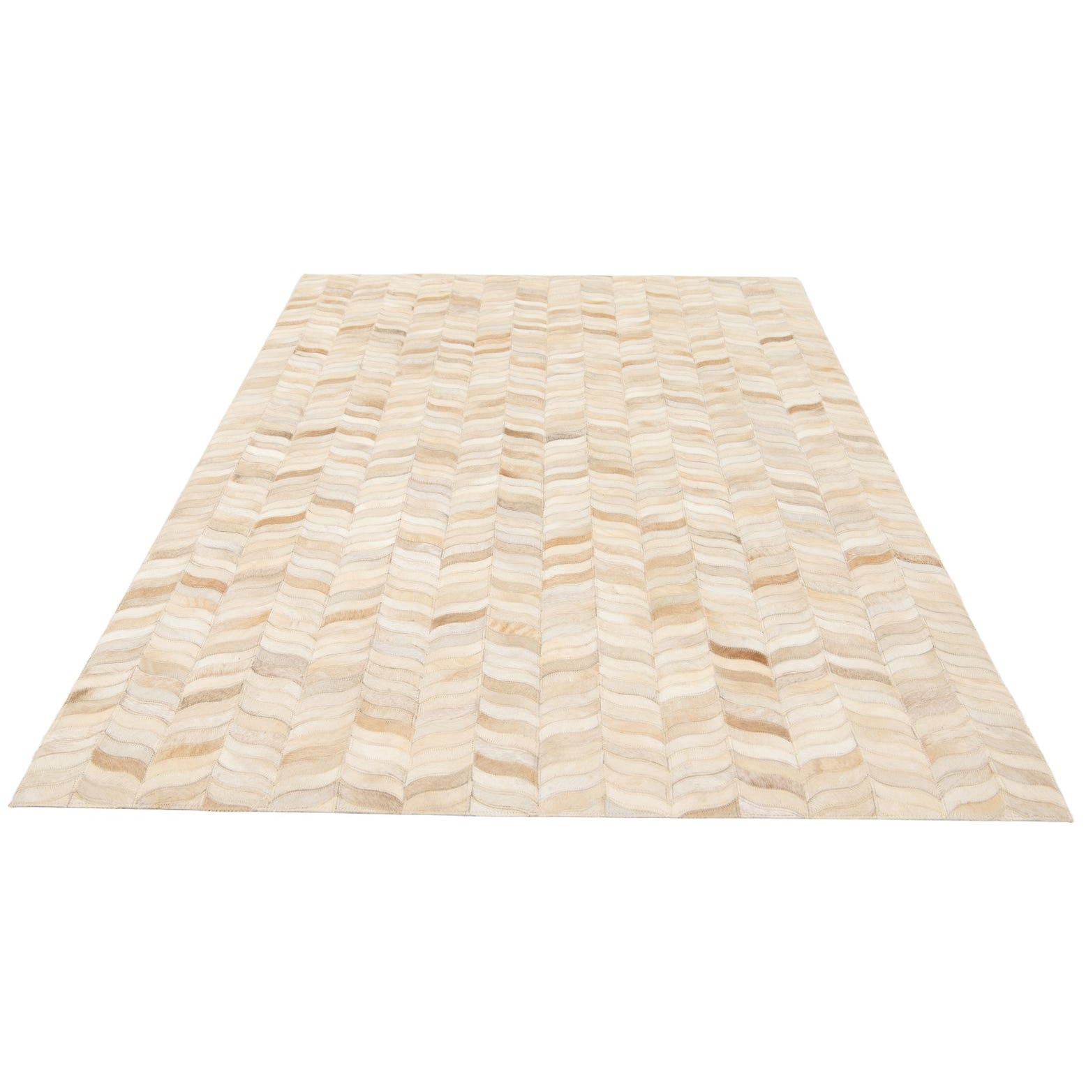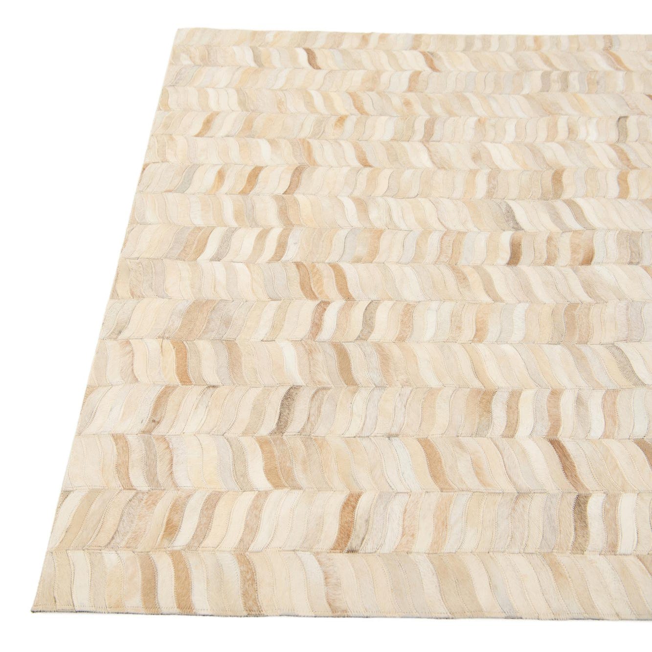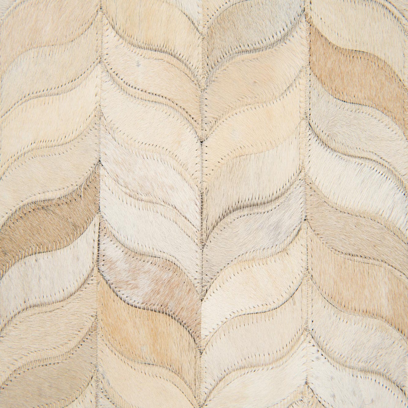 A softly patterned rug with a warm beige background, this hand made piece pairs narrow, wavy strips of cowhide in cream, ivory and touches of gray to form repeating vertical chevrons. Each panel is outlined with leather stitching that adds subtle relief and a tactile seam between hides. The hair-on cowhide surface feels velvety underfoot with a low, natural nap and a gentle sheen that catches light differently across the tonal variations.