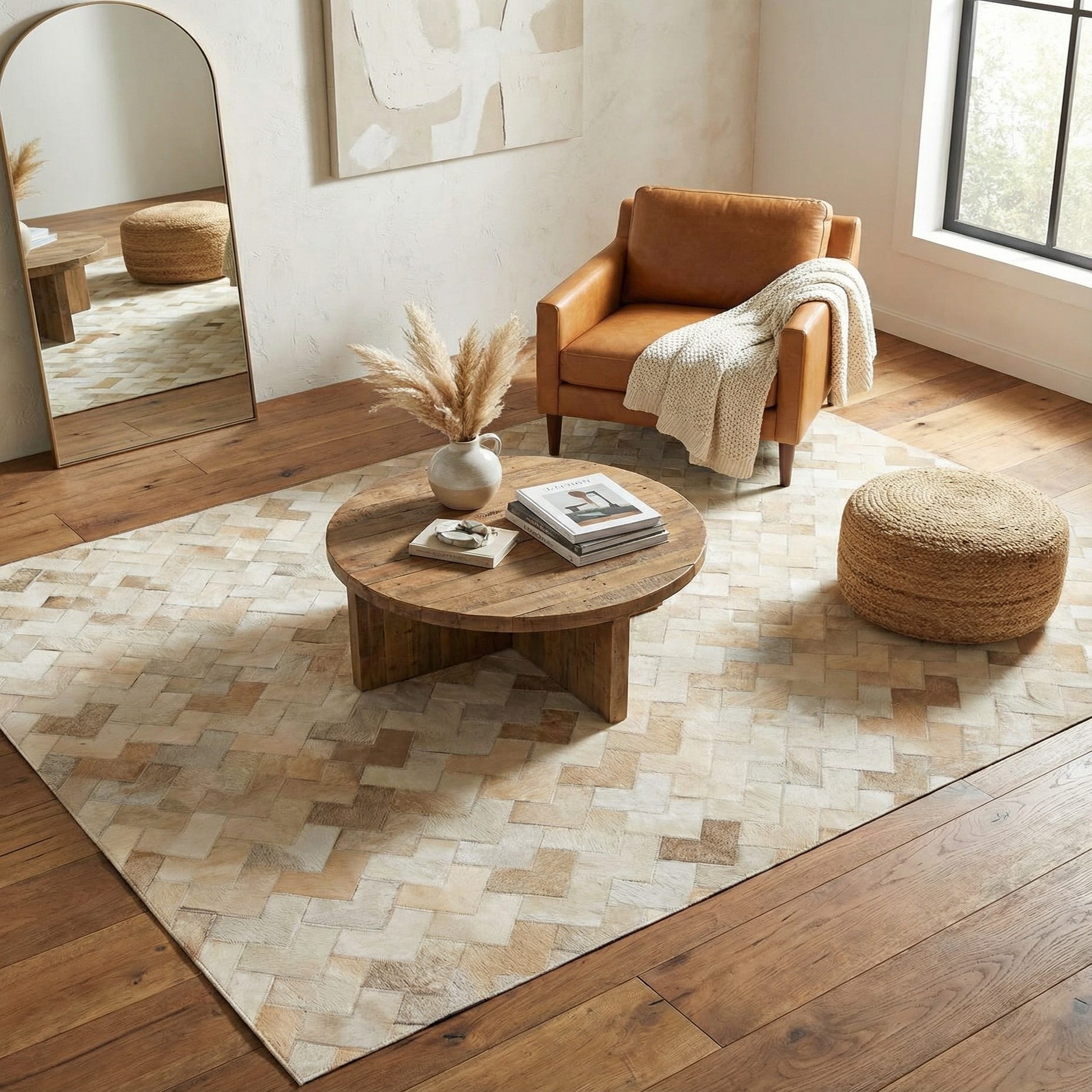 Hand made of cowhide and leather, this rug is constructed from small V-shaped hide patches sewn together to form a soft, chevron-like mosaic. The beige background is warmed by ivory and tan patches with occasional gray accents, creating a subtle, natural variation in tone. The hair-on-hide surface has a low, tactile nap that you can feel underfoot, while the visible stitching and leather edges give the piece a crafted, textural quality.