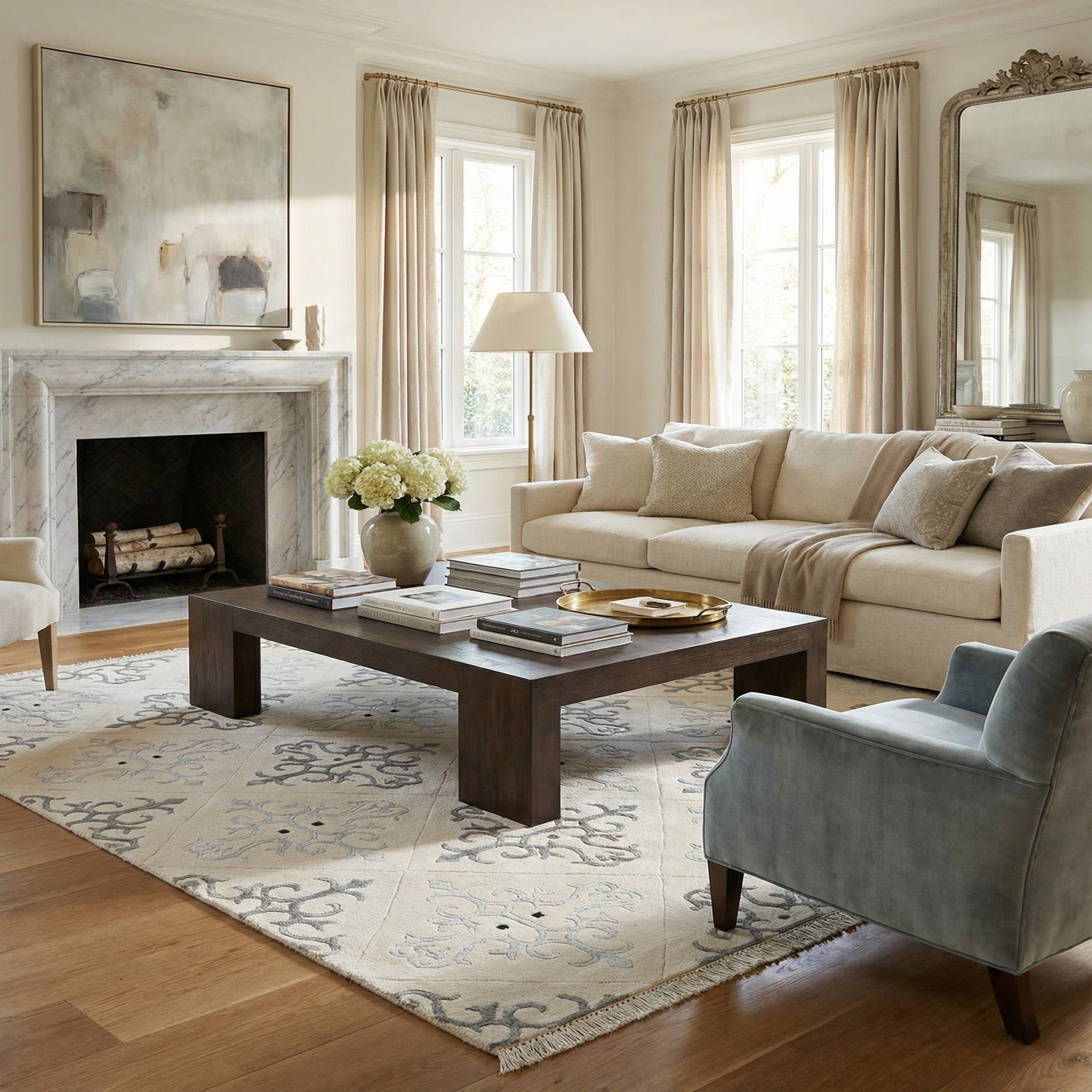 The soft texture and refined color scheme enable this rug to be a subtle yet sophisticated anchor in diverse interior settings. Its muted tones and balanced pattern make this rug particularly well-suited for spaces that aim for a serene and inviting atmosphere, such as living rooms, bedrooms, or private studies. It could comfortably fit within minimalist, contemporary, or traditional design schemes, enhancing the space without overwhelming it. The hand-made construction adds a touch of artisanal charm to the rug, making it a valuable addition for those who appreciate craftsmanship.