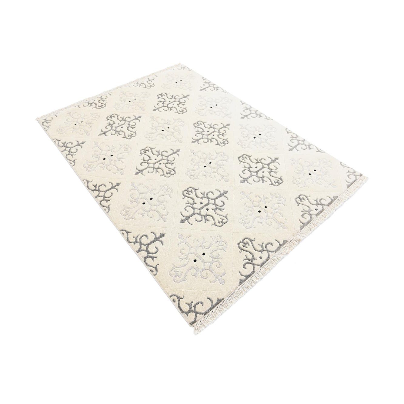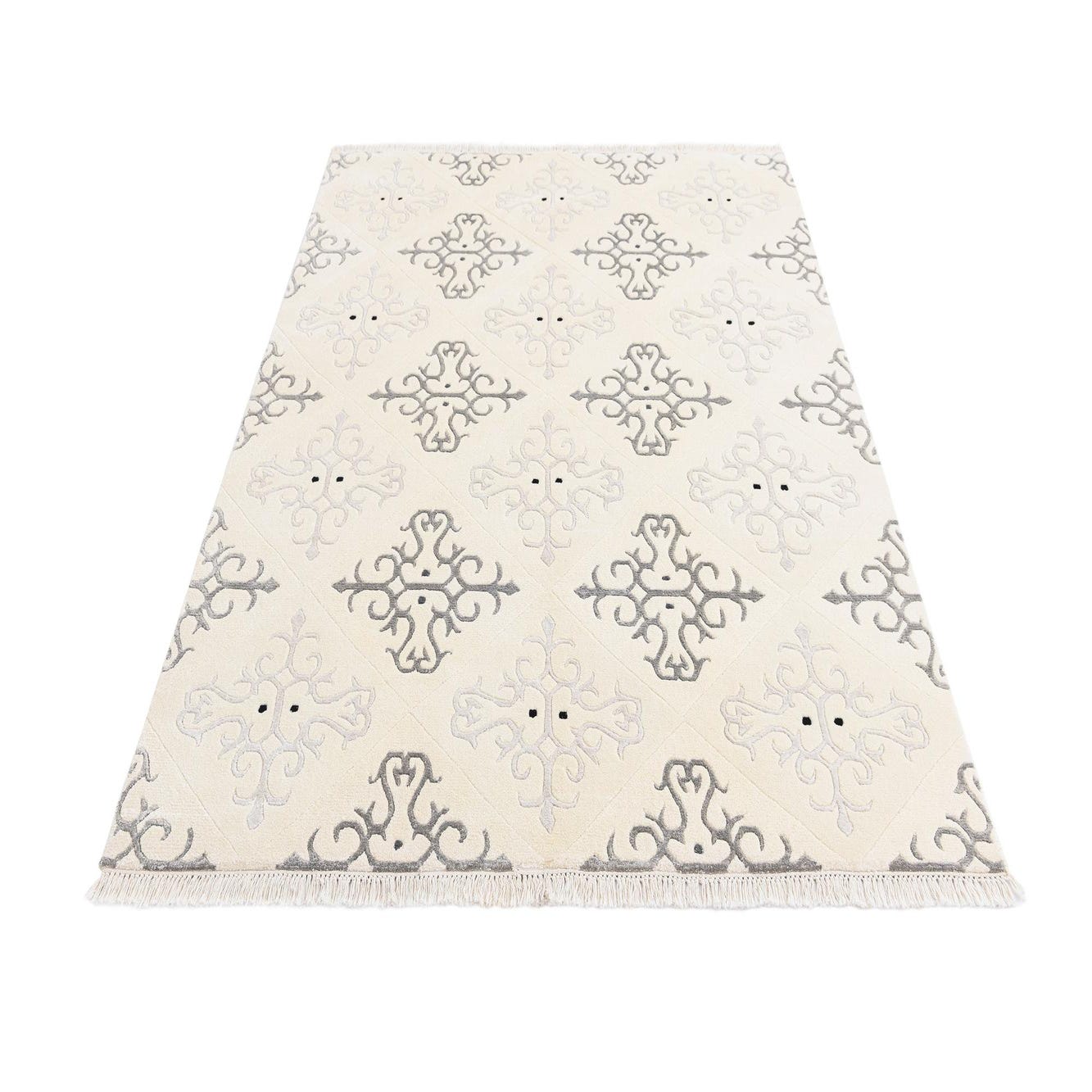 The Darya Collection offers a 4x6 rug handcrafted with a blend of wool and cotton, providing a balance of durability and softness. This piece features an elegant symmetrical pattern, highlighting interconnected forms and floral-inspired motifs in a neutral color palette including shades of beige, black, gray, and silver set against a beige background. The design carries a certain timelessness, ensuring versatility in various decor styles.
