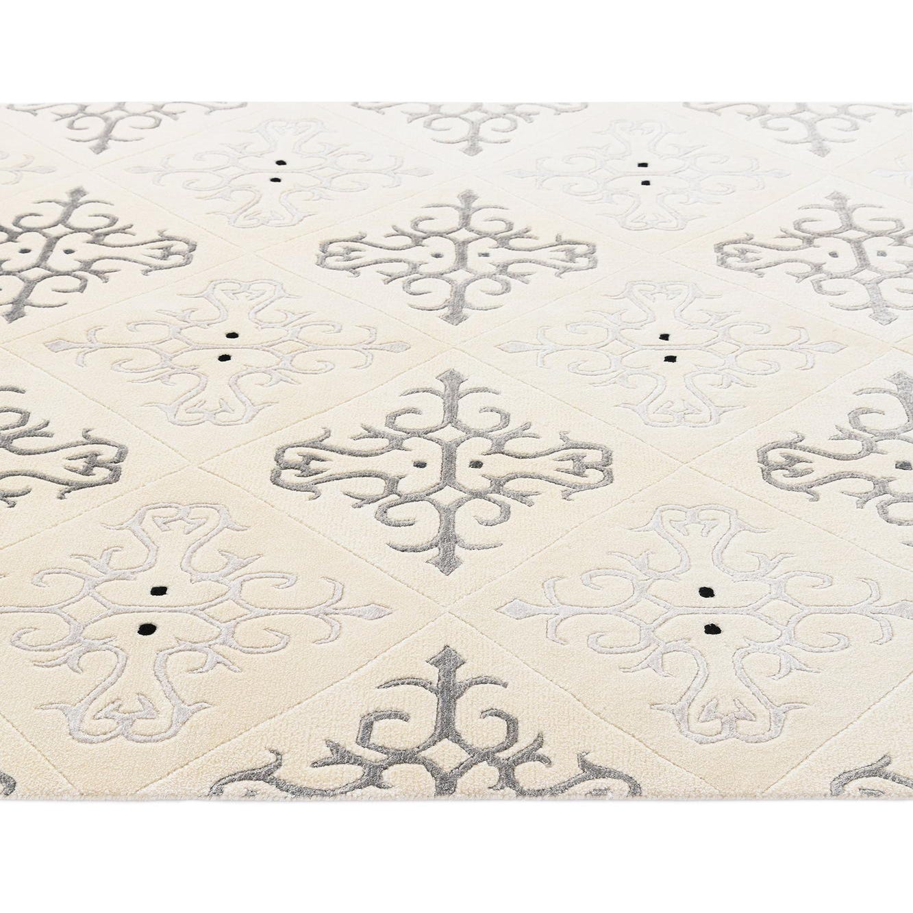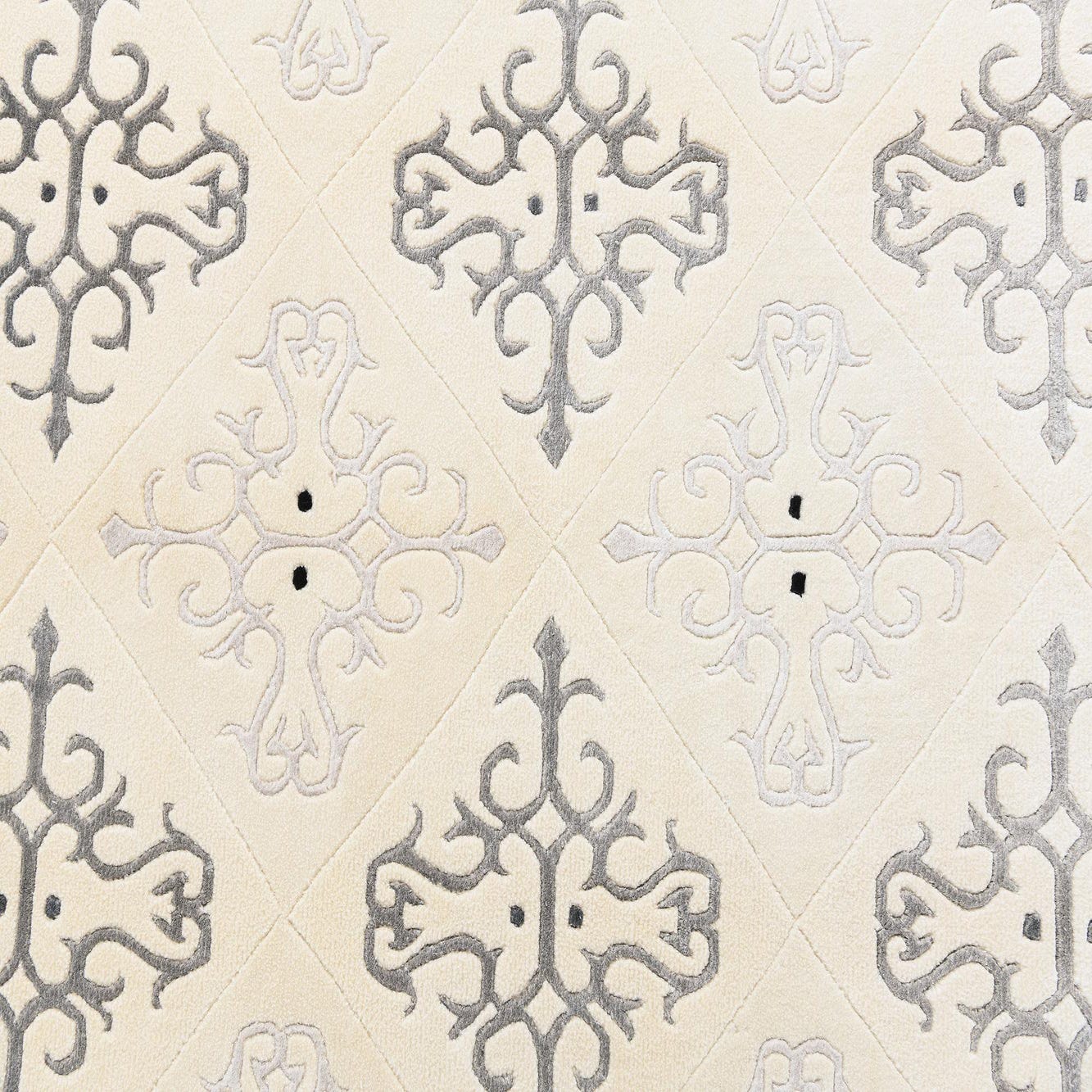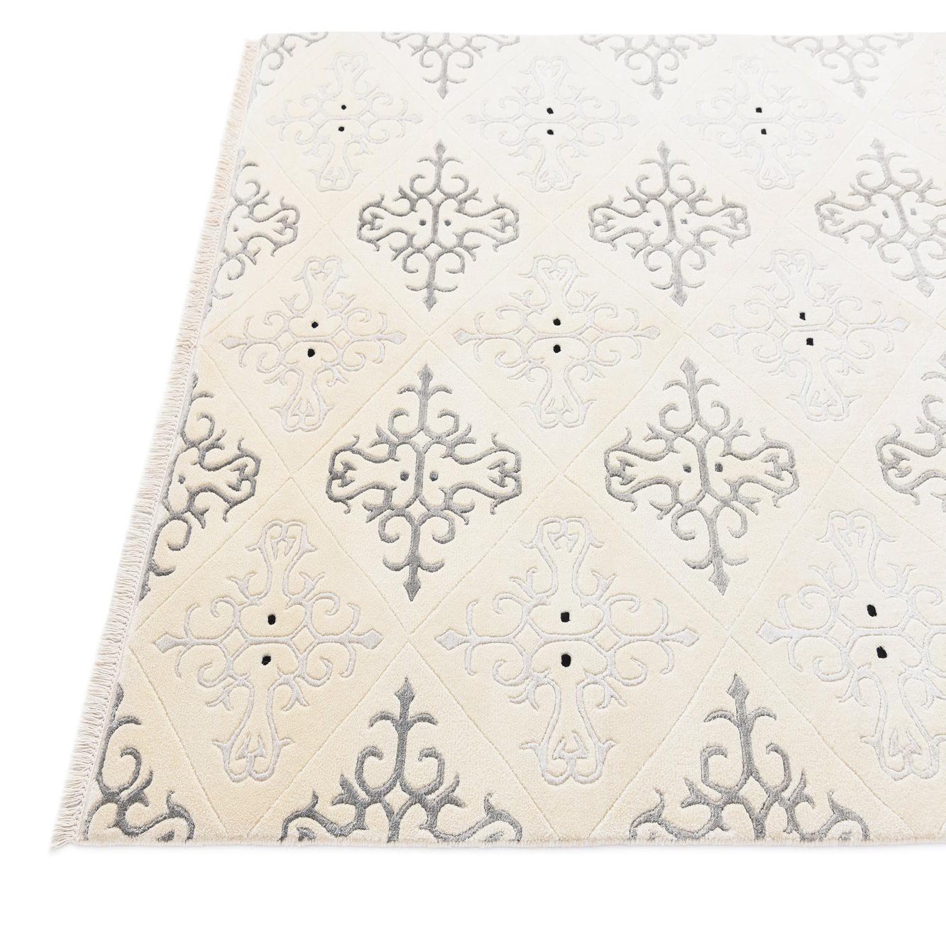 Primary color is Beige. Colors in this rug include: Beige, Black, Gray, Silver.