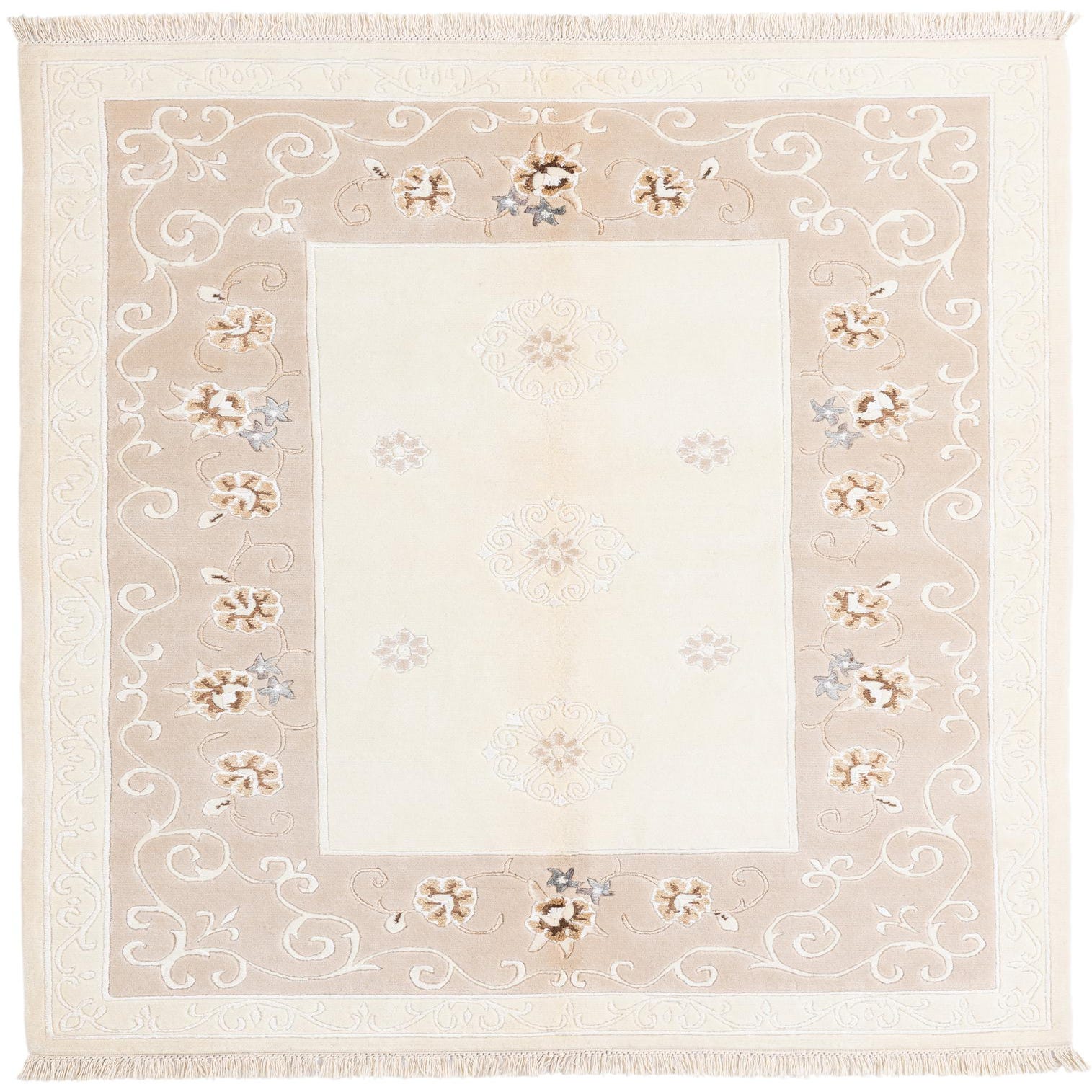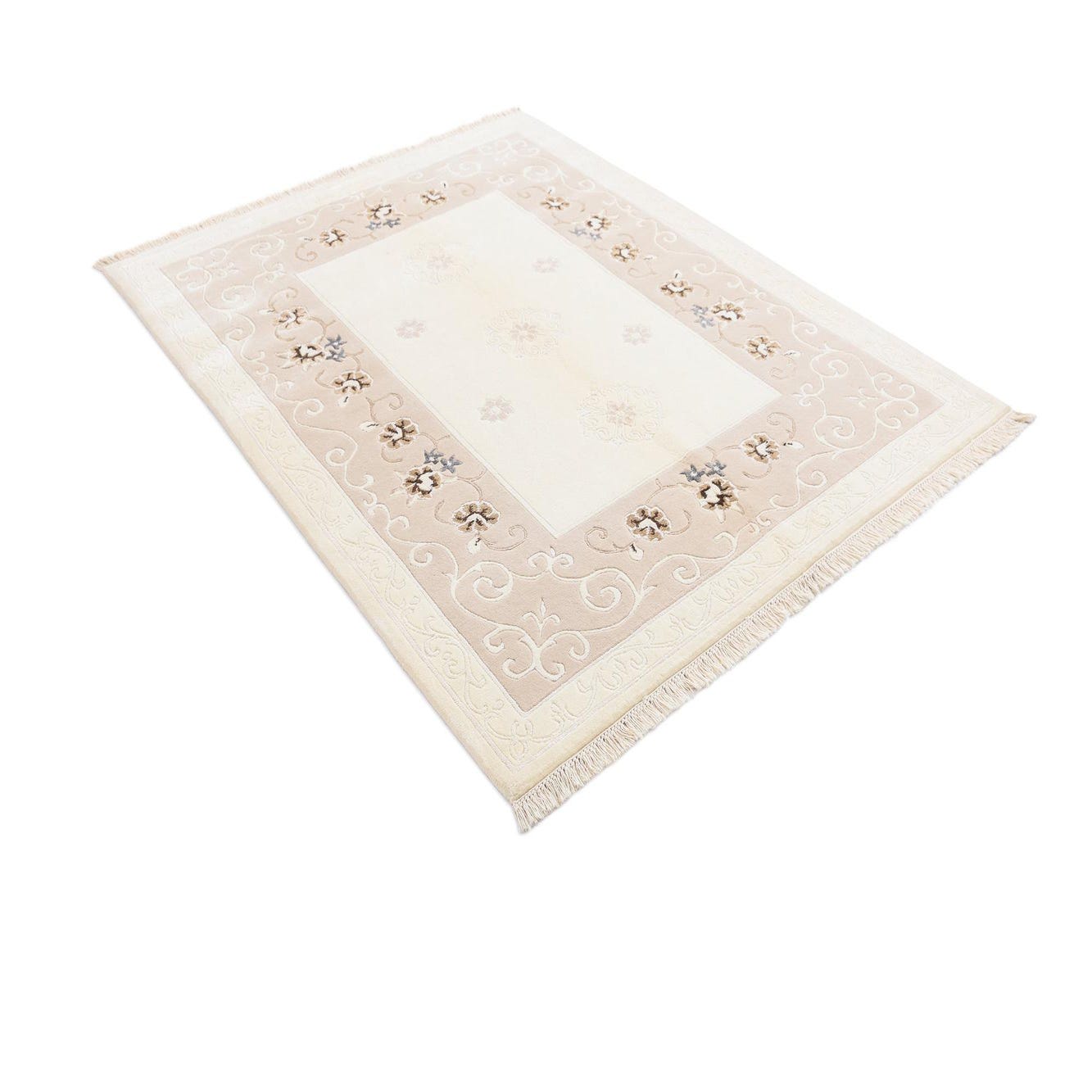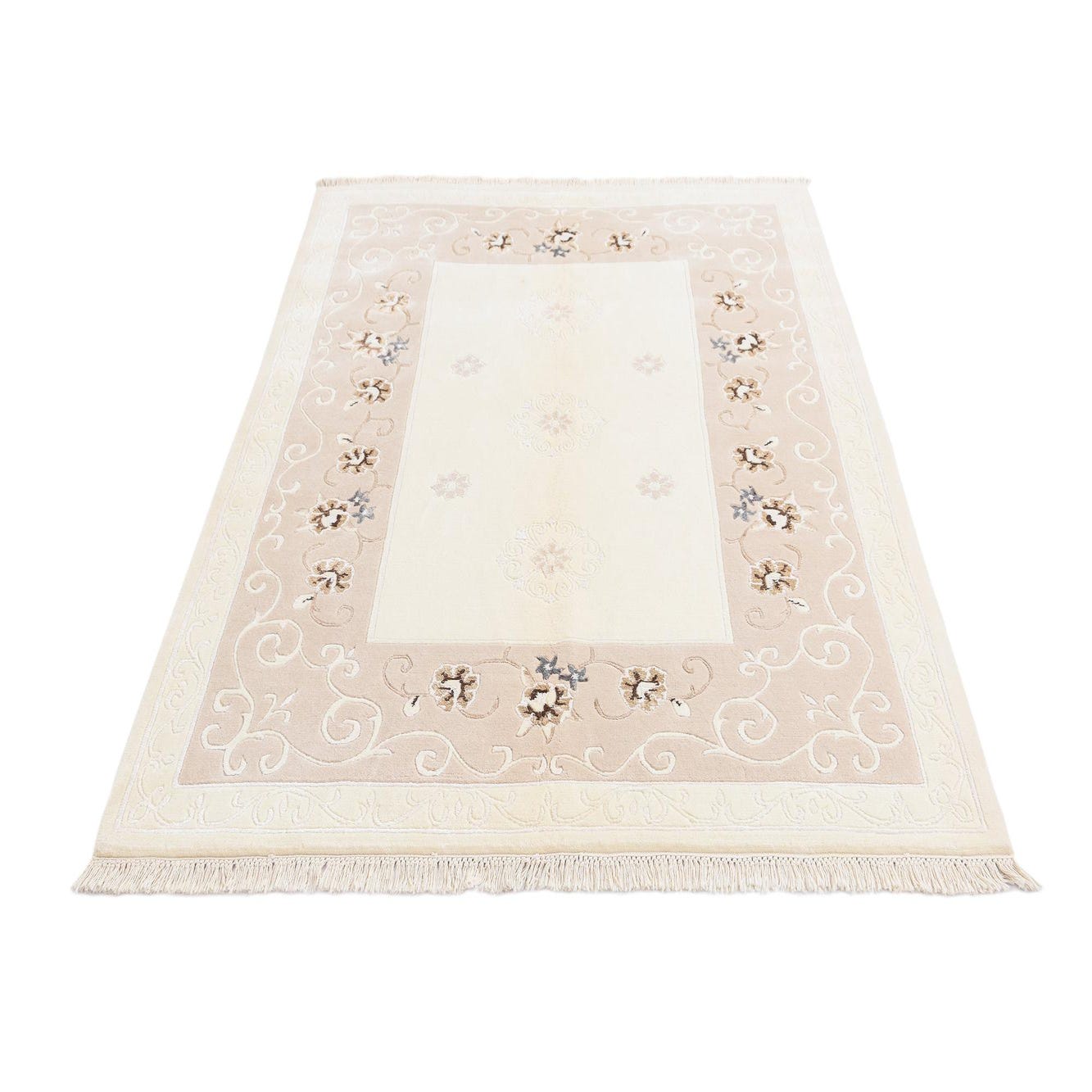 The Darya Collection offers a timeless and sophisticated addition to any interior space with this handcrafted 4x6 wool and cotton rug. Dominated by a warm beige background, the rug features an elegant array of colors including brown, gray, ivory, and light brown, harmoniously blended into its design. The central focus is a subtly ornate medallion, surrounded by complementary accent motifs and an intricate border, showcasing floral patterns and swirling vines. The combination of wool and cotton provides a soft, plush texture that invites touch while ensuring durability.