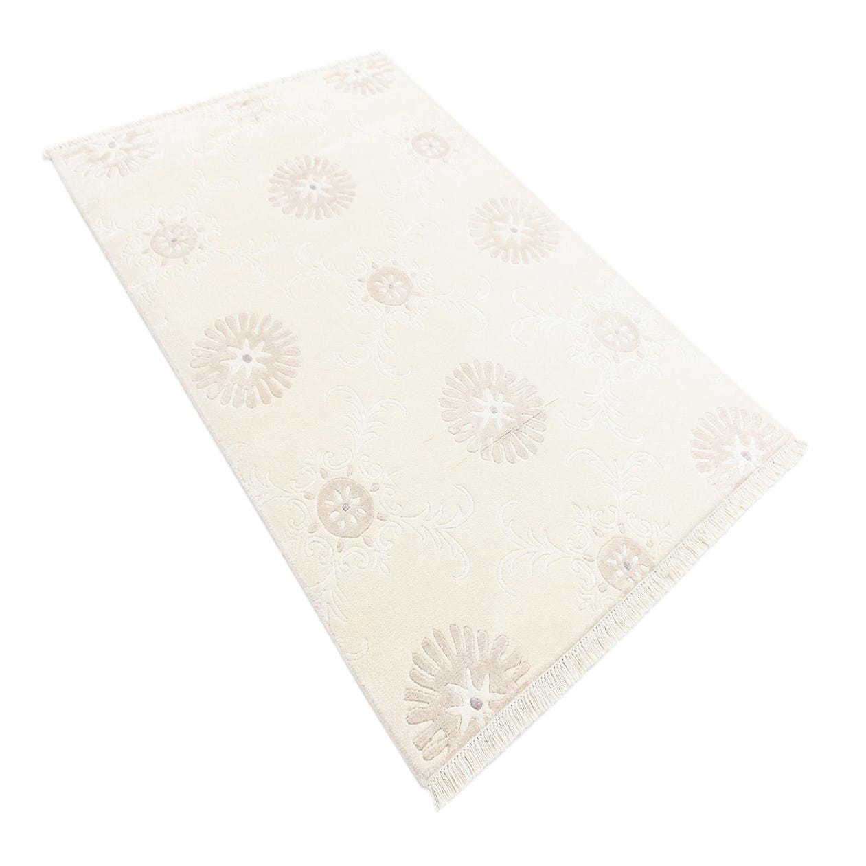 A 4x6 rectangular Darya rug in cream and tan, featuring a modern Persian medallion pattern with high pile and fringe.