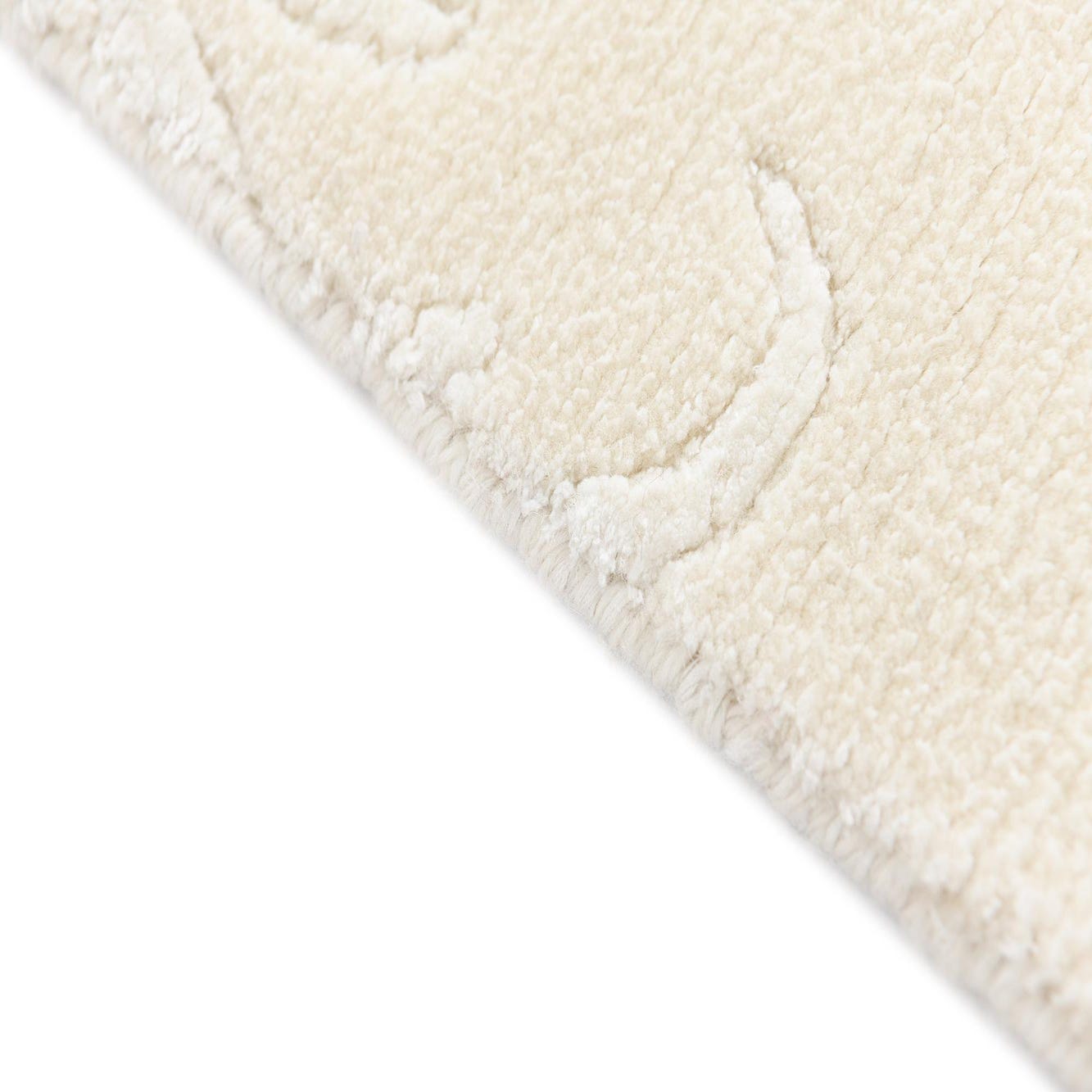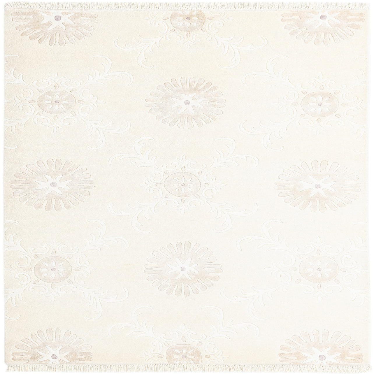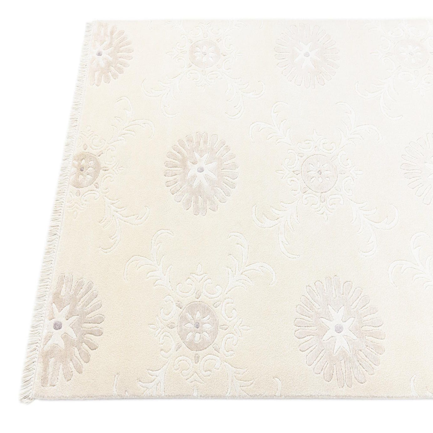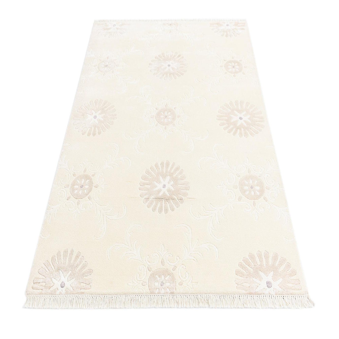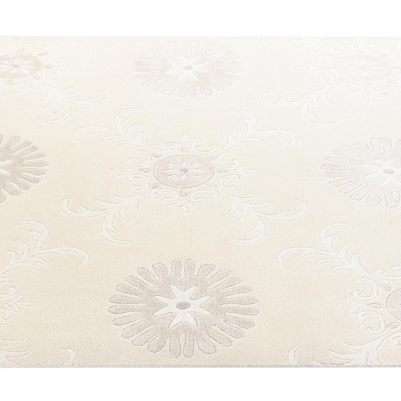 The Darya collection presents a classic 4x6 area rug handcrafted from a blend of wool and cotton, ensuring durability and a soft feel underfoot. This piece showcases a symmetrical pattern with ornamental motifs that evoke a sense of timeless elegance. The plush texture of the pile is complemented by a serene palette of beige, ivory, plum red, and tan, with beige as the dominant background color.