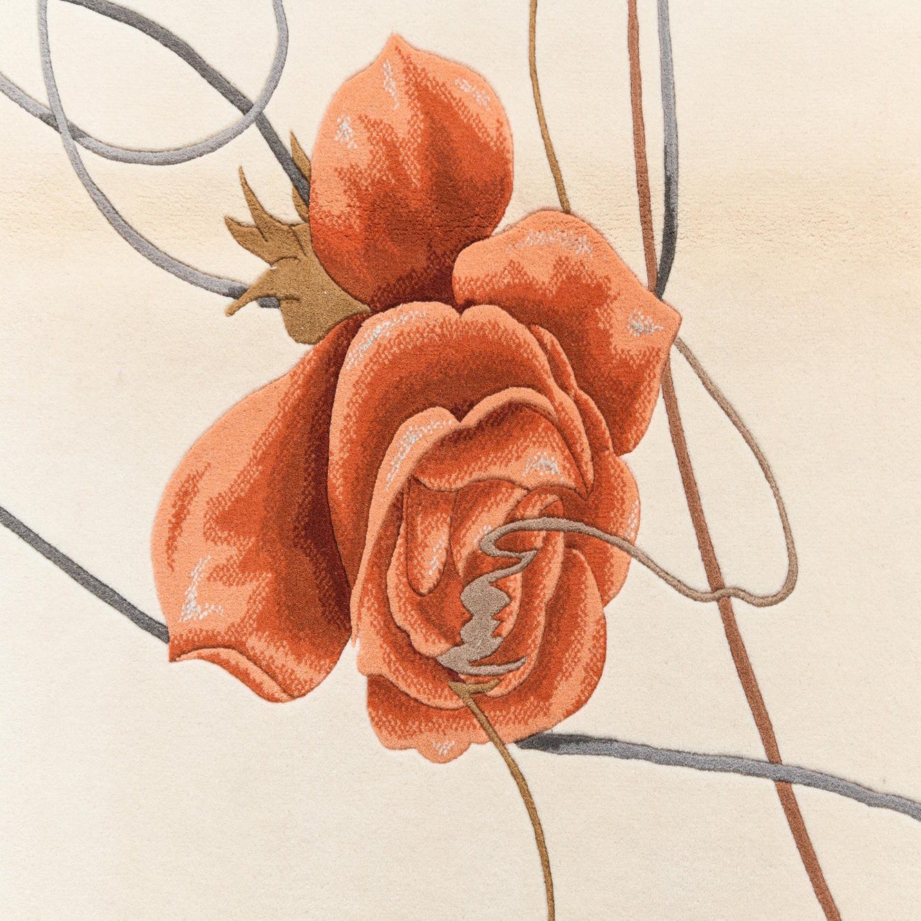 The Darya collection rug is a handcrafted piece that showcases a blend of artisanal craftsmanship and elegant design. Measuring 4x6 feet, the rug exhibits a Beige background with a prominent floral pattern that captures the eye. The stylized flower, depicted in vivid shades of Terracotta and Orange, is complemented by graceful, flowing lines in Gray and Silver. Accents of Gold subtly embellish the leaves, adding a touch of luminosity to the overall design. The Light Brown and Brown lines define the borders providing structure to the artistic composition.